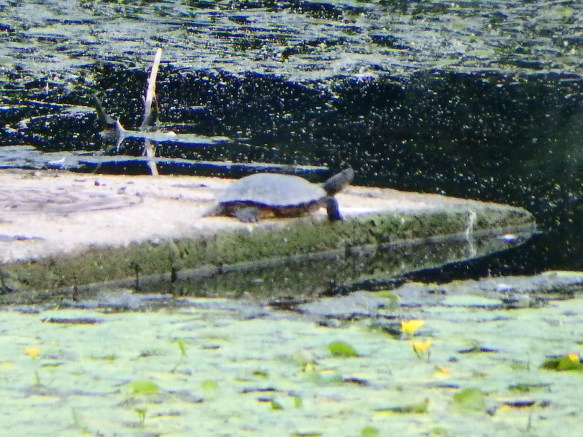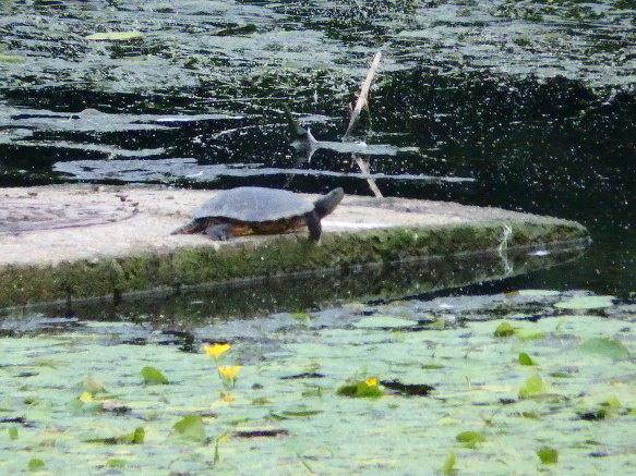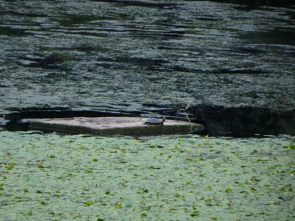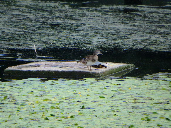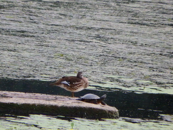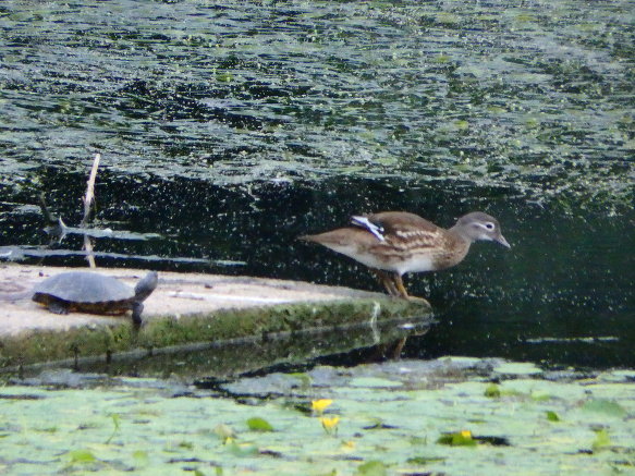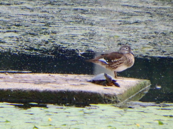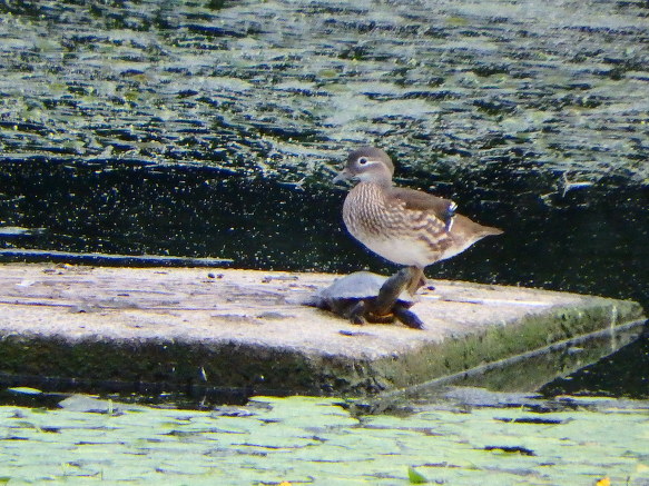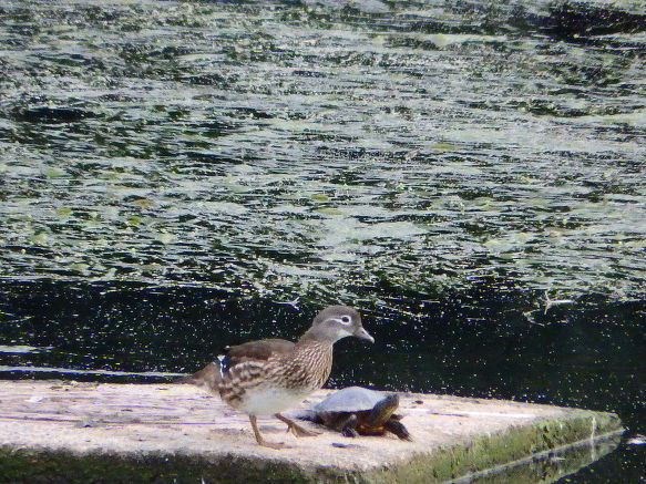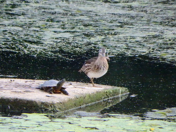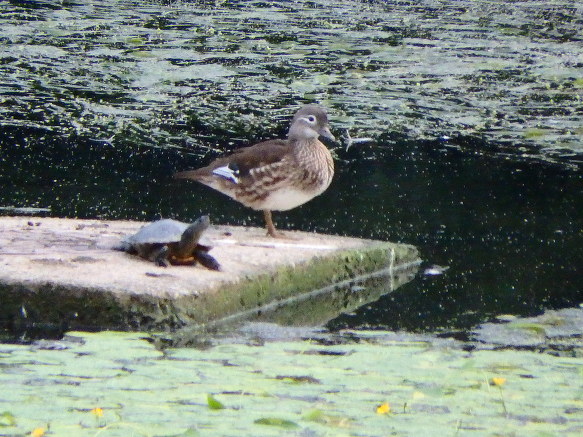 자라와 원앙이가 강물 복판의 쉼터에 있었다.