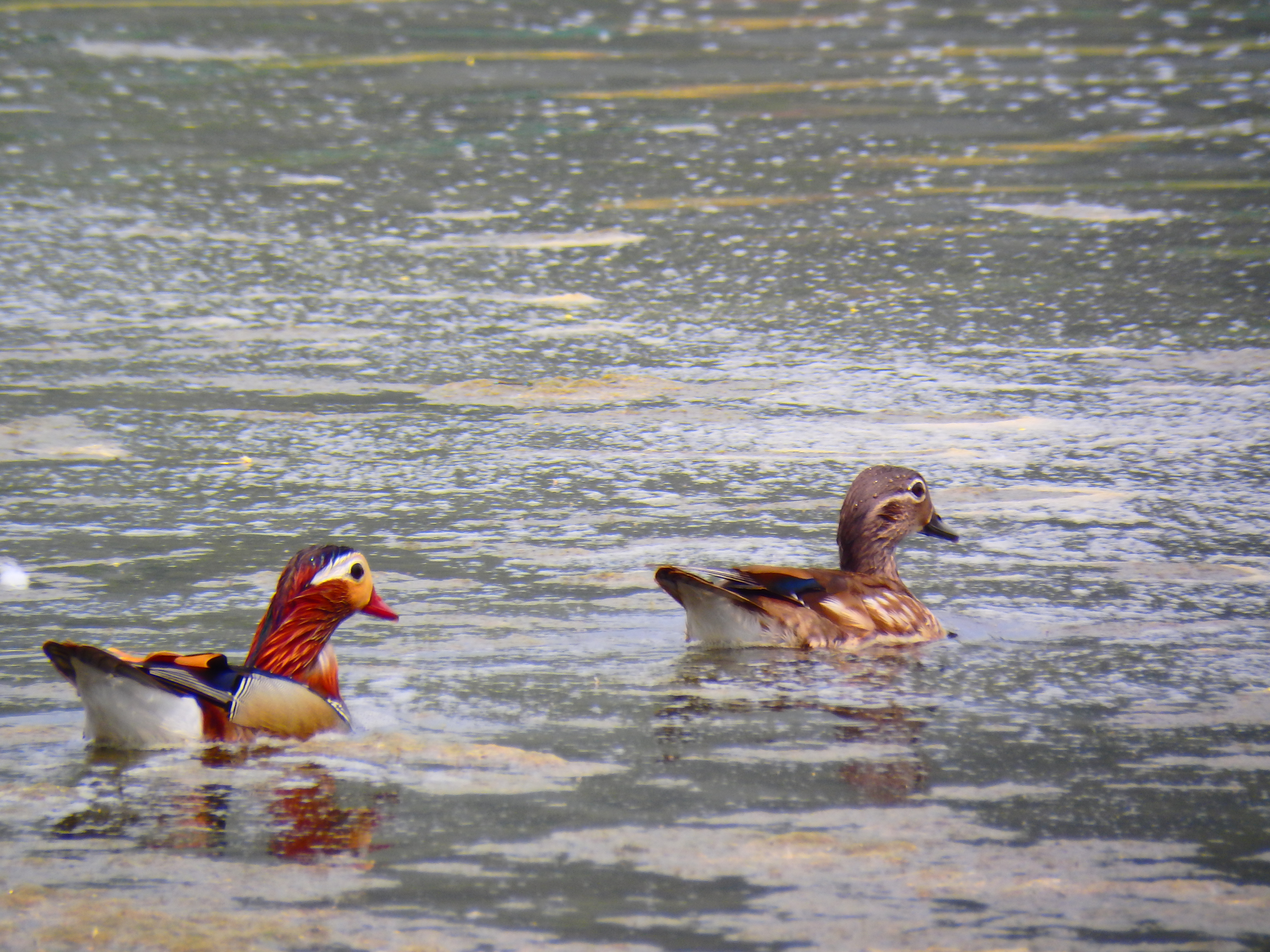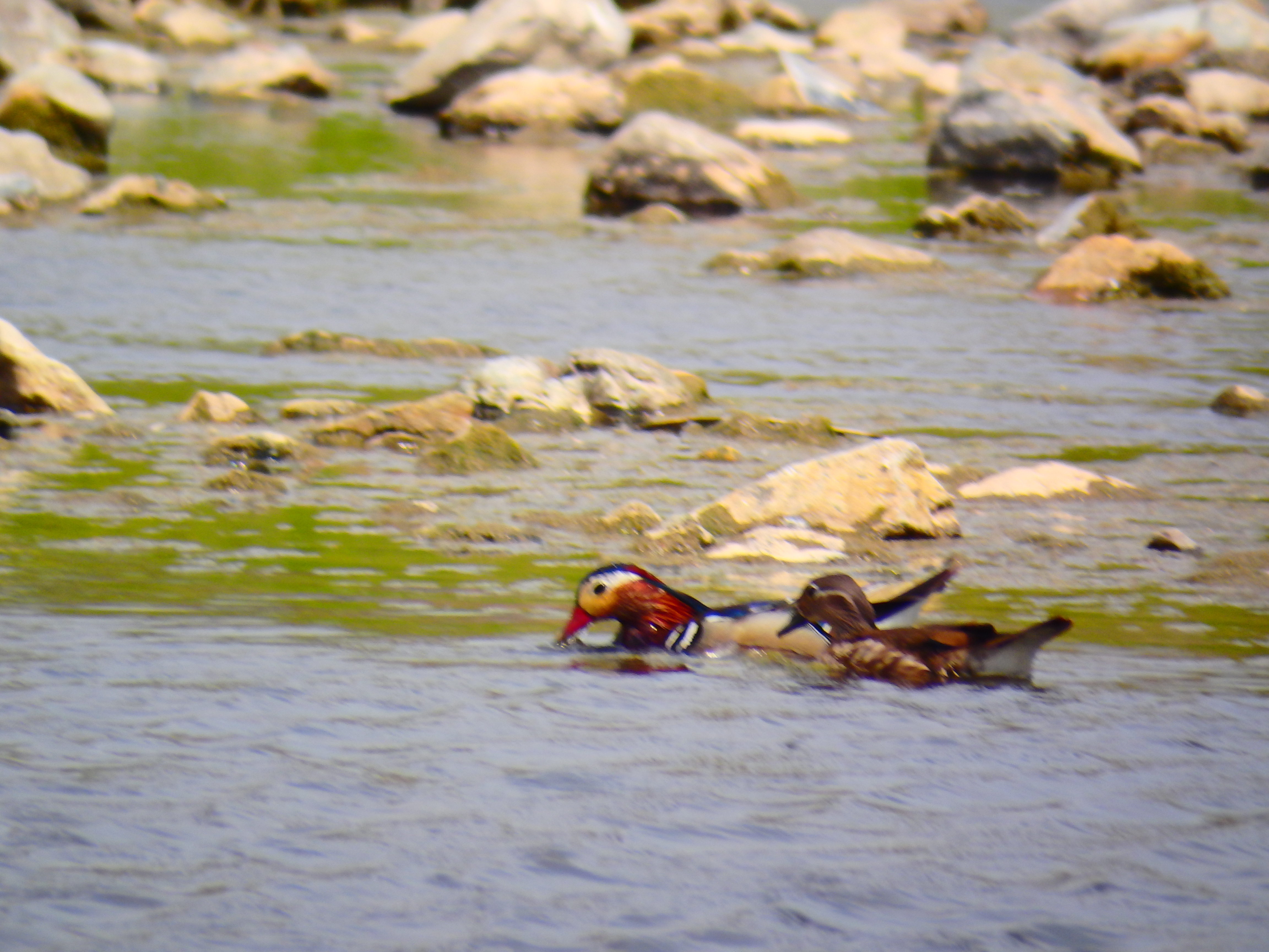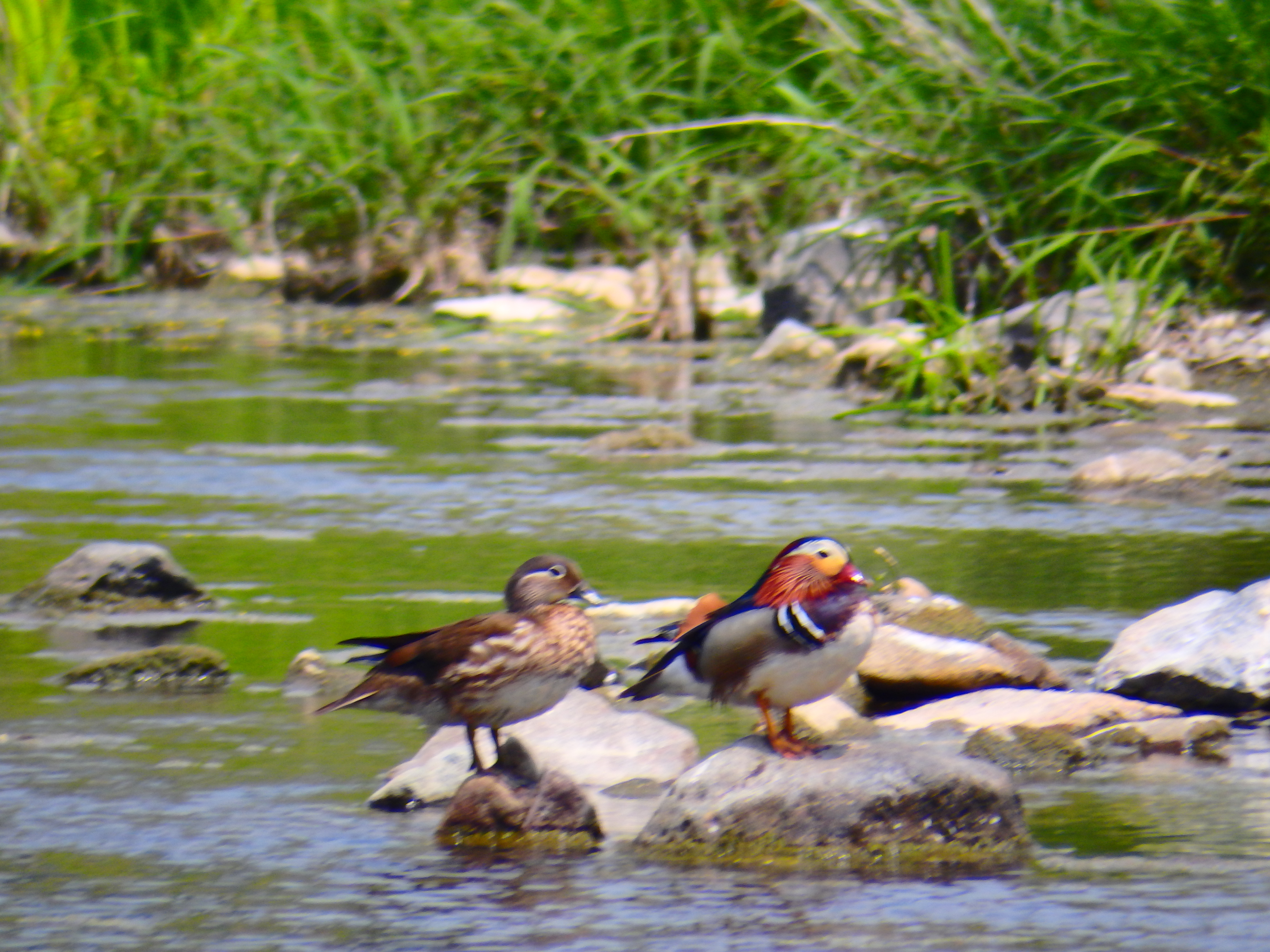 수초 사이로 원앙새 부부가 먹이를 찾다가 이쪽으로 갈까