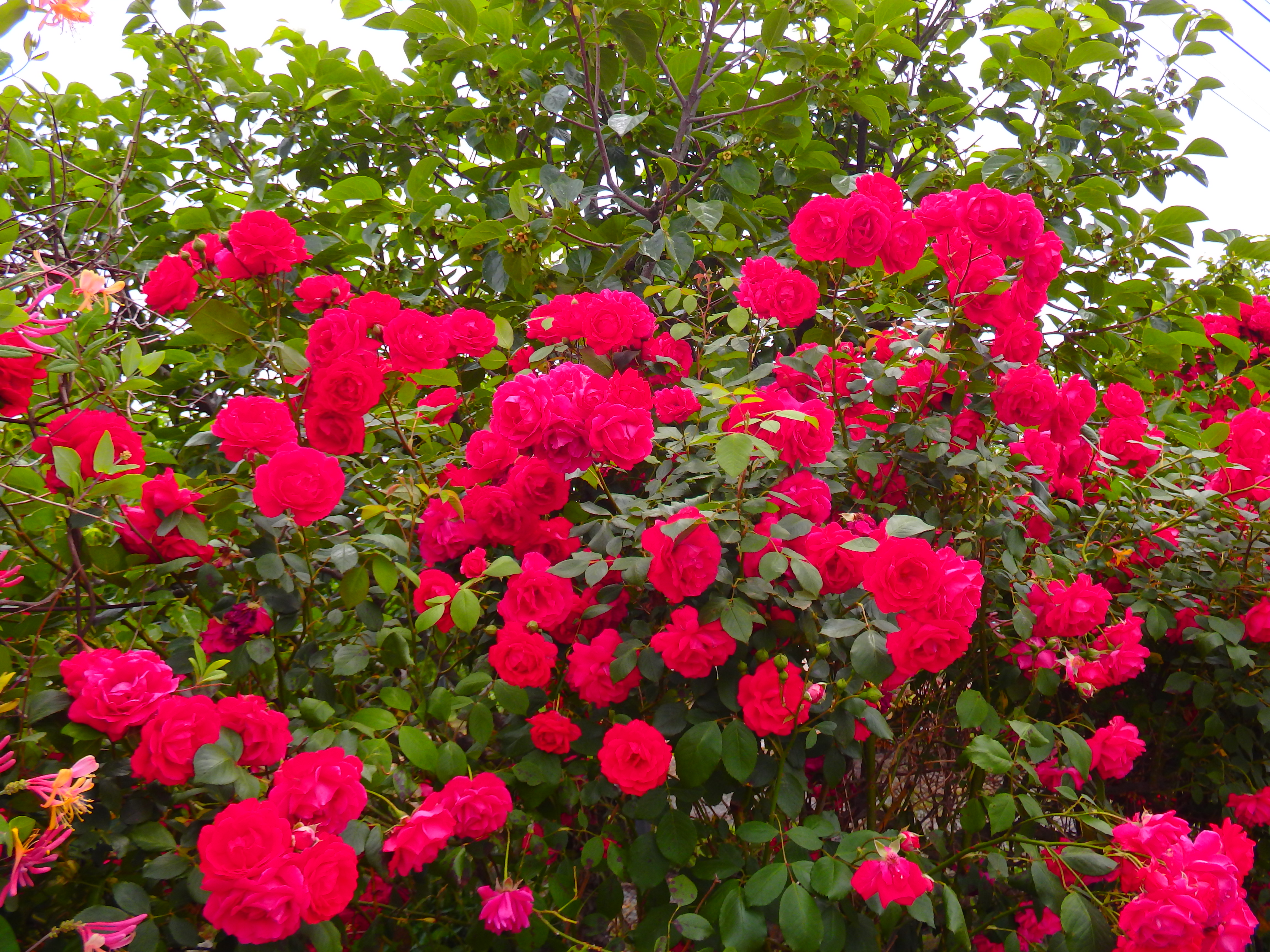 백 미터가량의 과수원 담장에 붉은 장미꽃이 너무