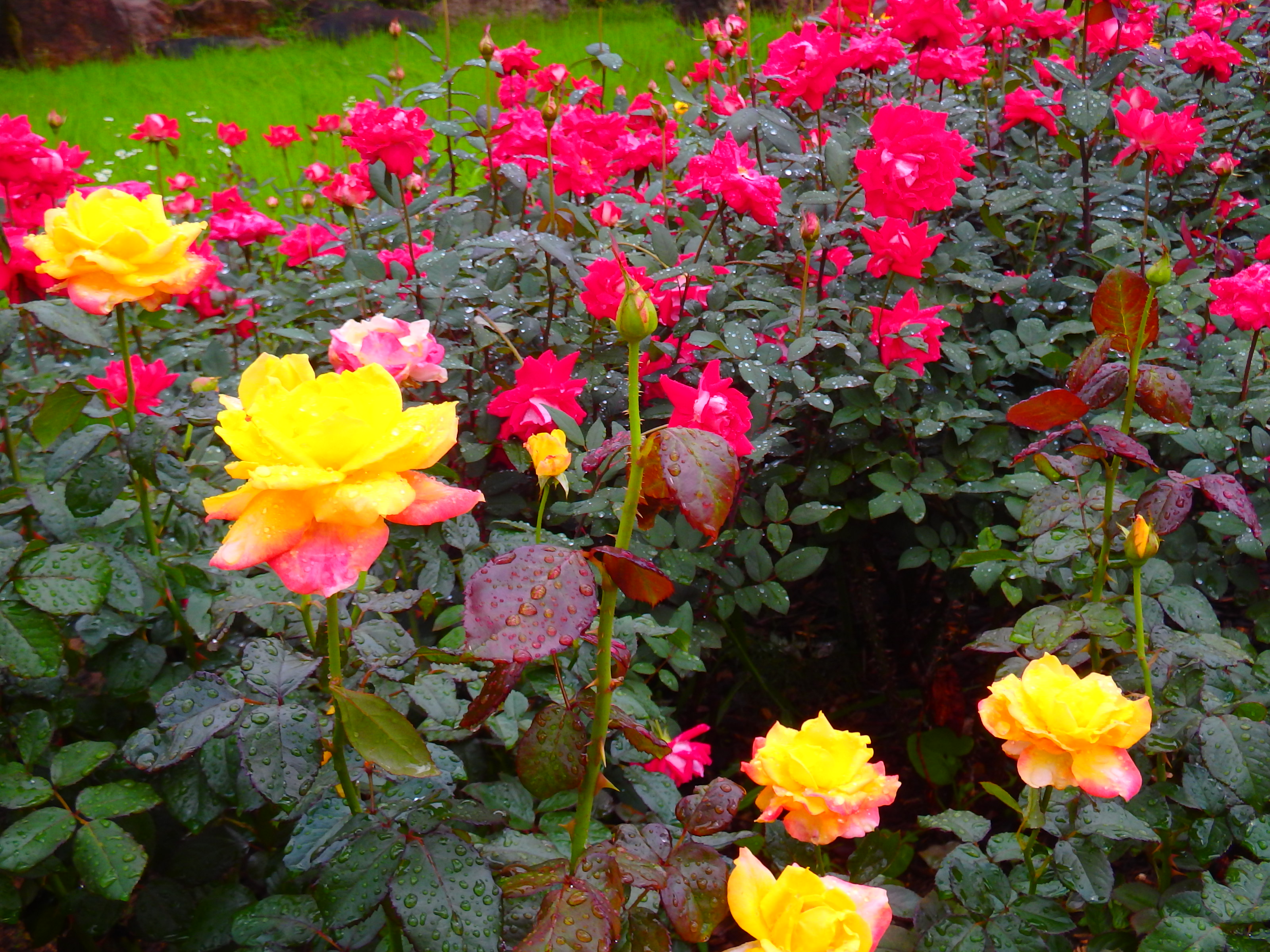 폭우뒤의 강력한 에너지의 효험은 장미꽃들의