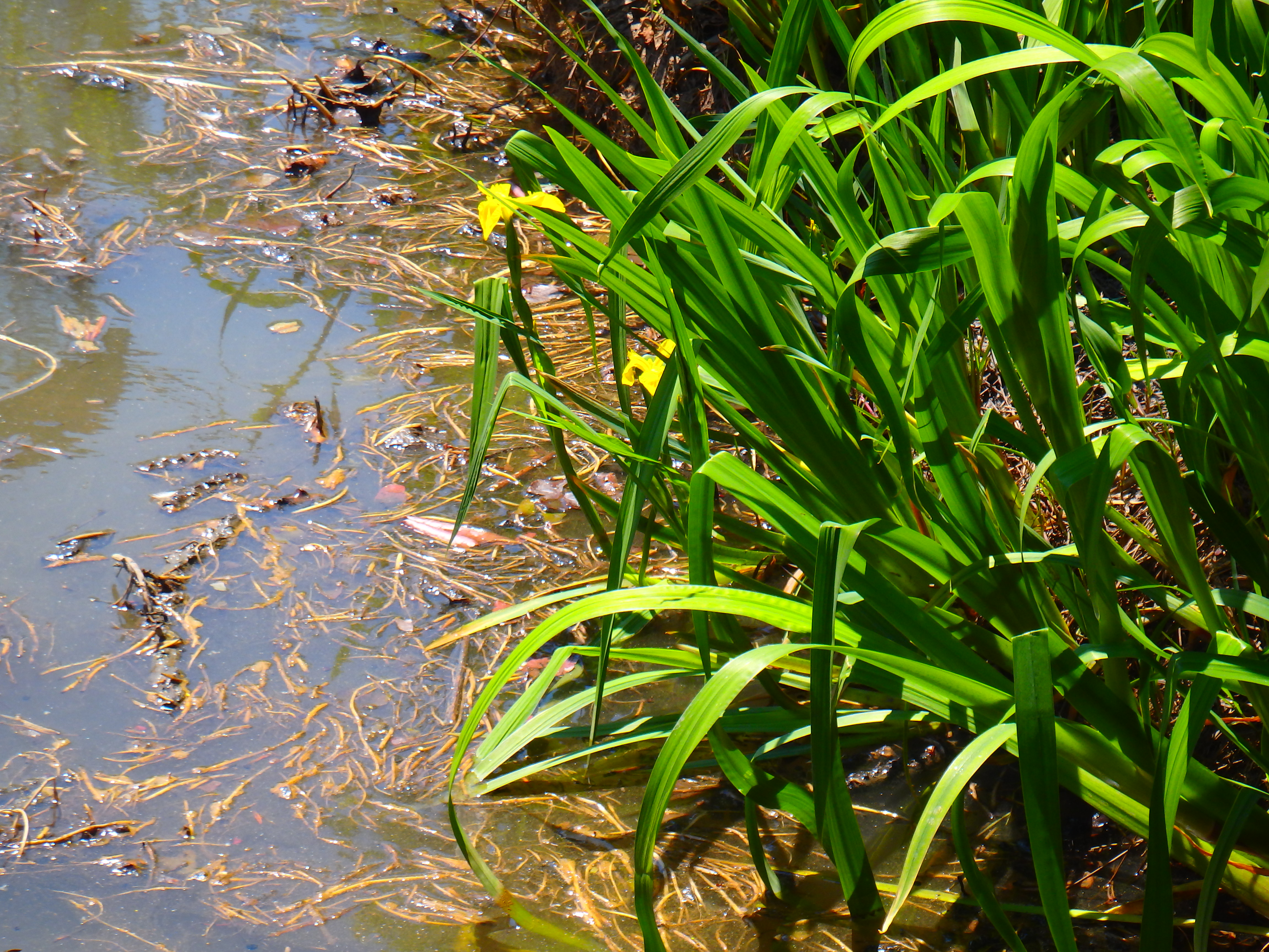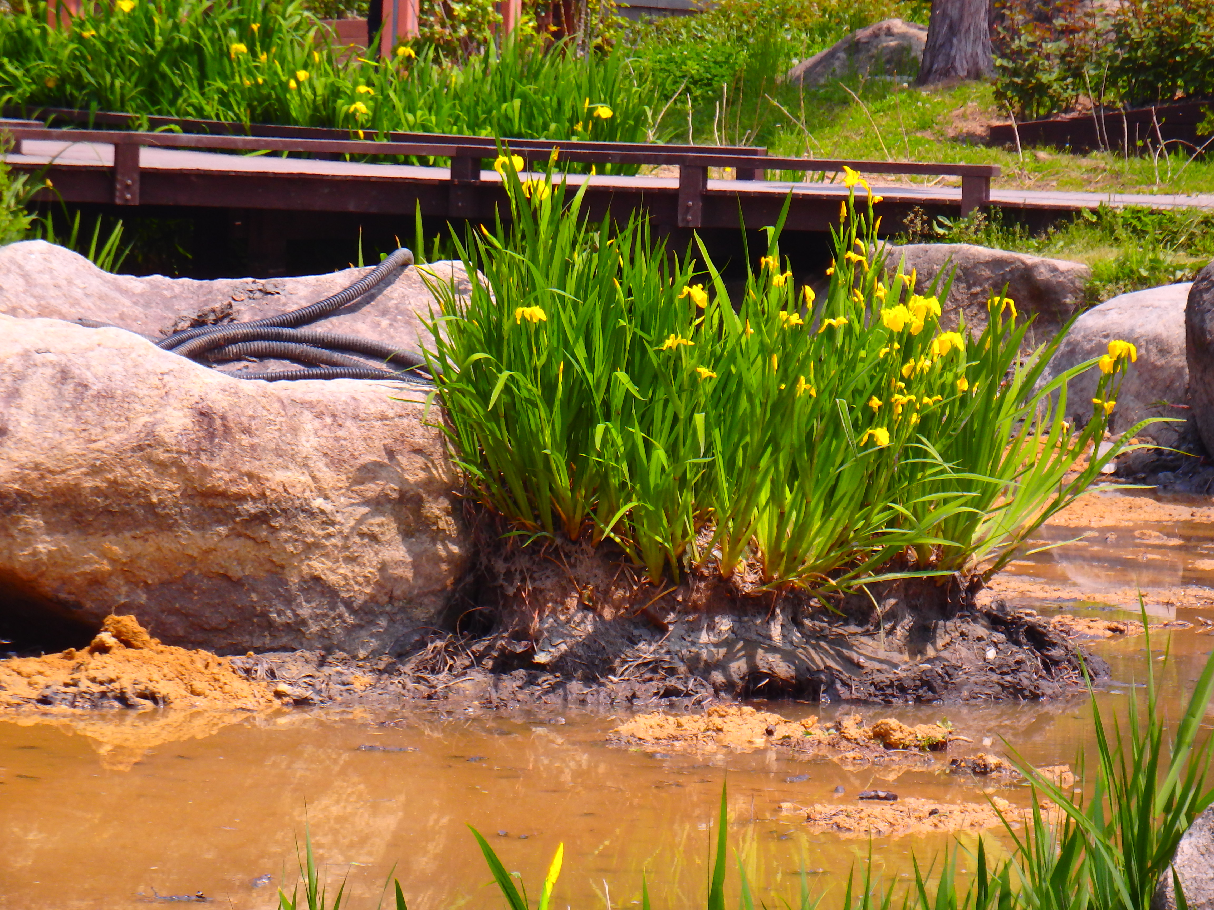 노오란 창포가 푸른잎 속에서 피어났다.