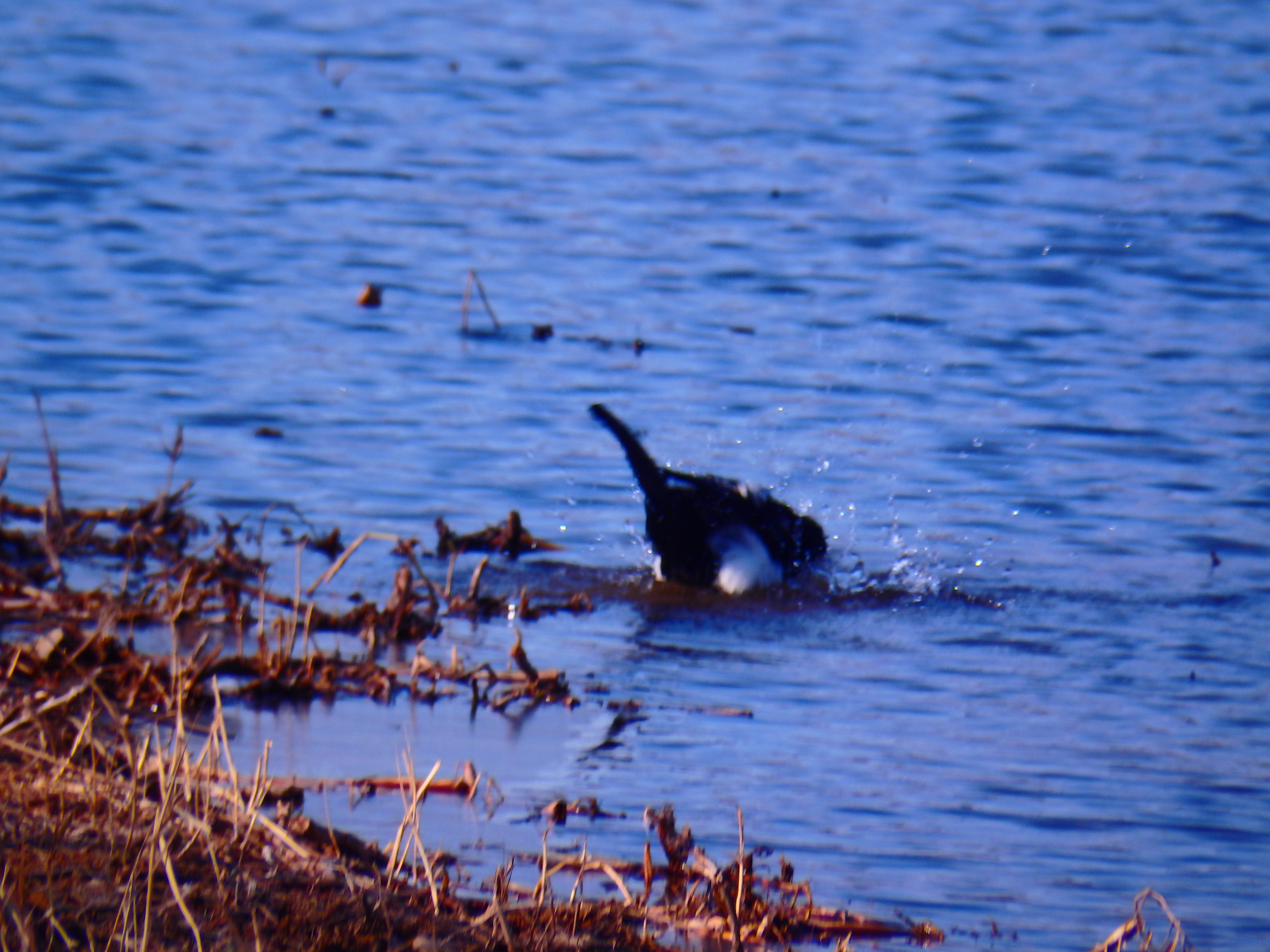 차가운 강물에 날개를 푸닥거리며