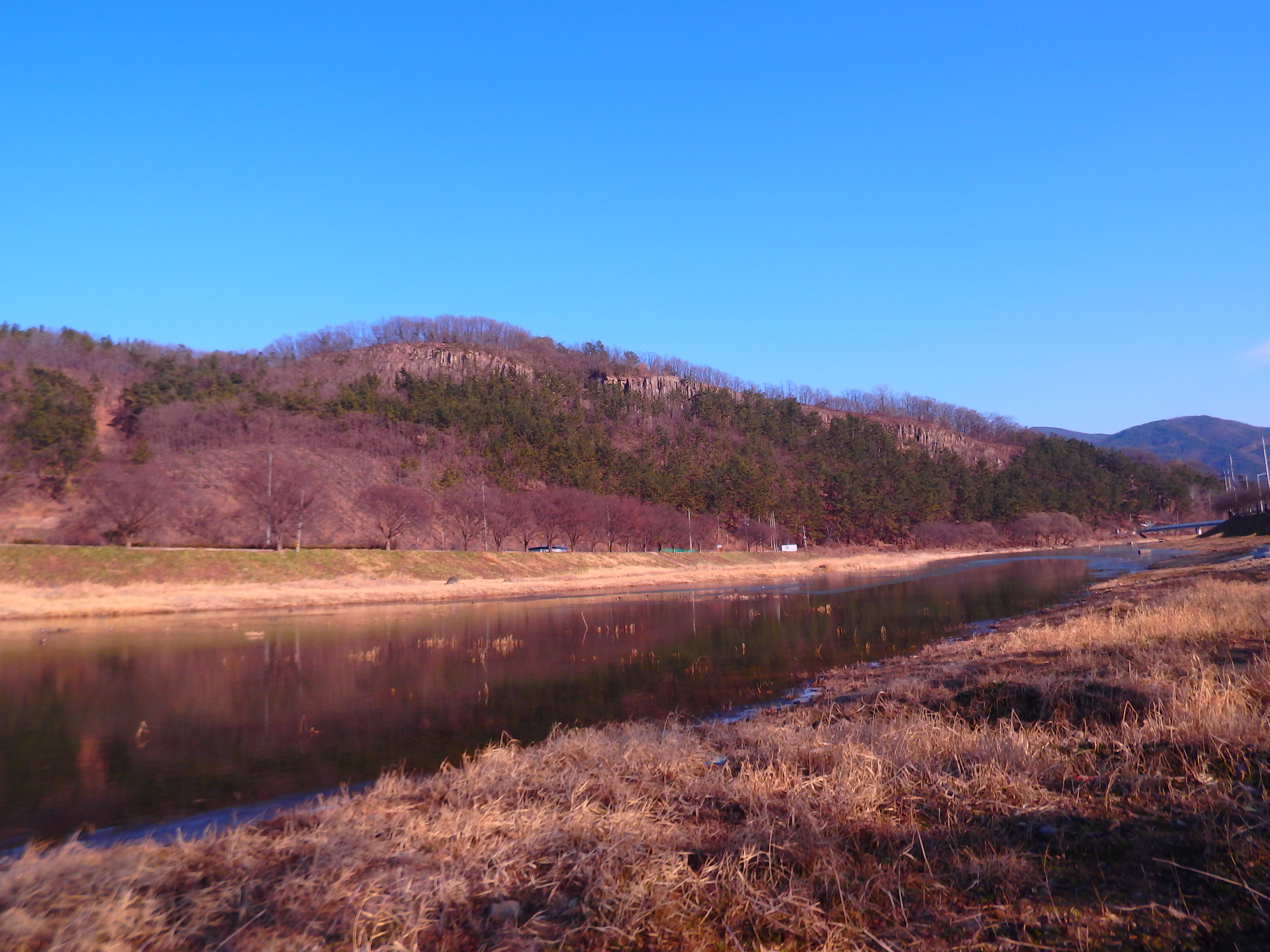 산들이 병풍처럼 둘린 강변에서