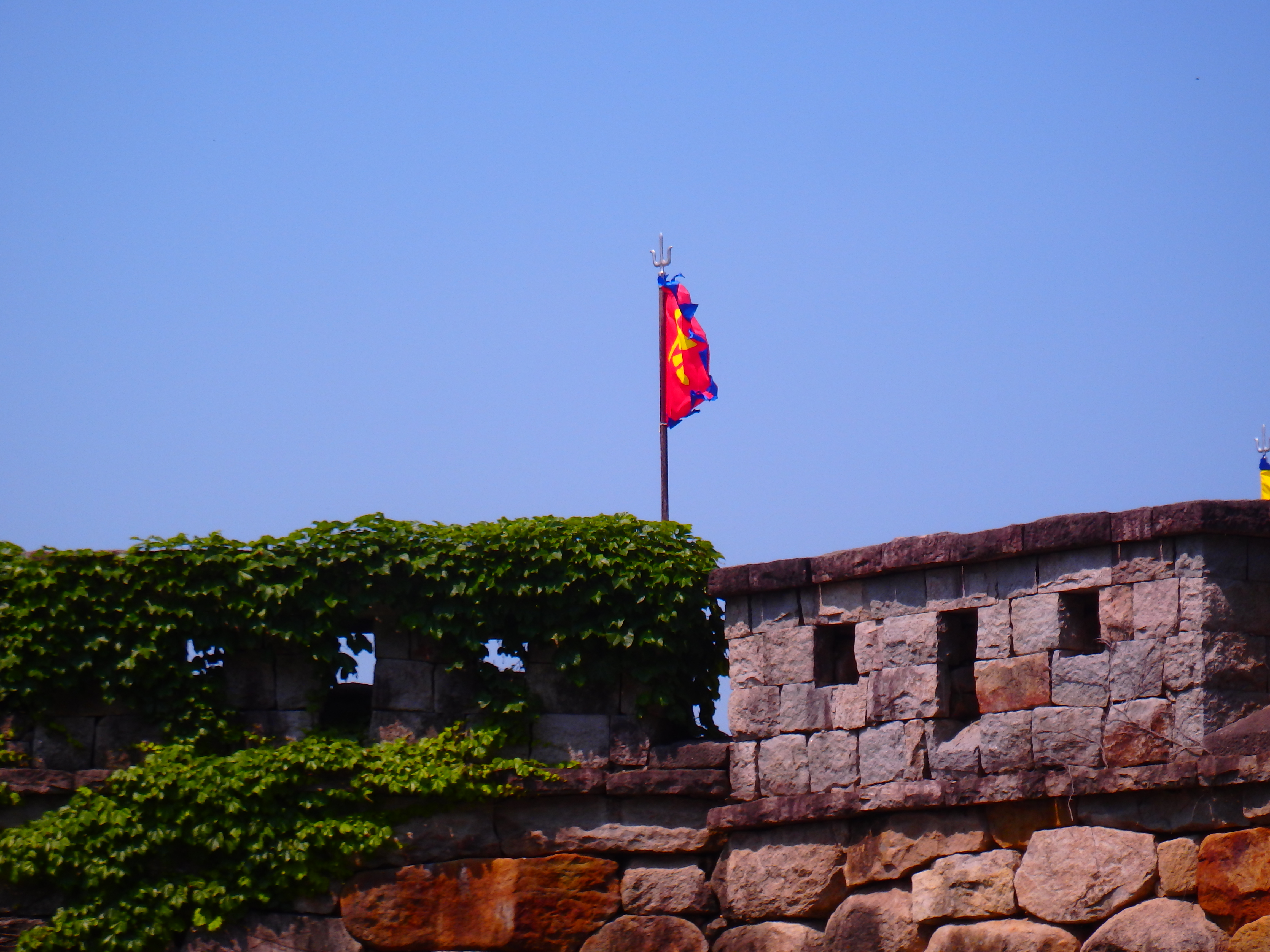 깃발이 휘날리는 성벽을 따라 걷는 동안
