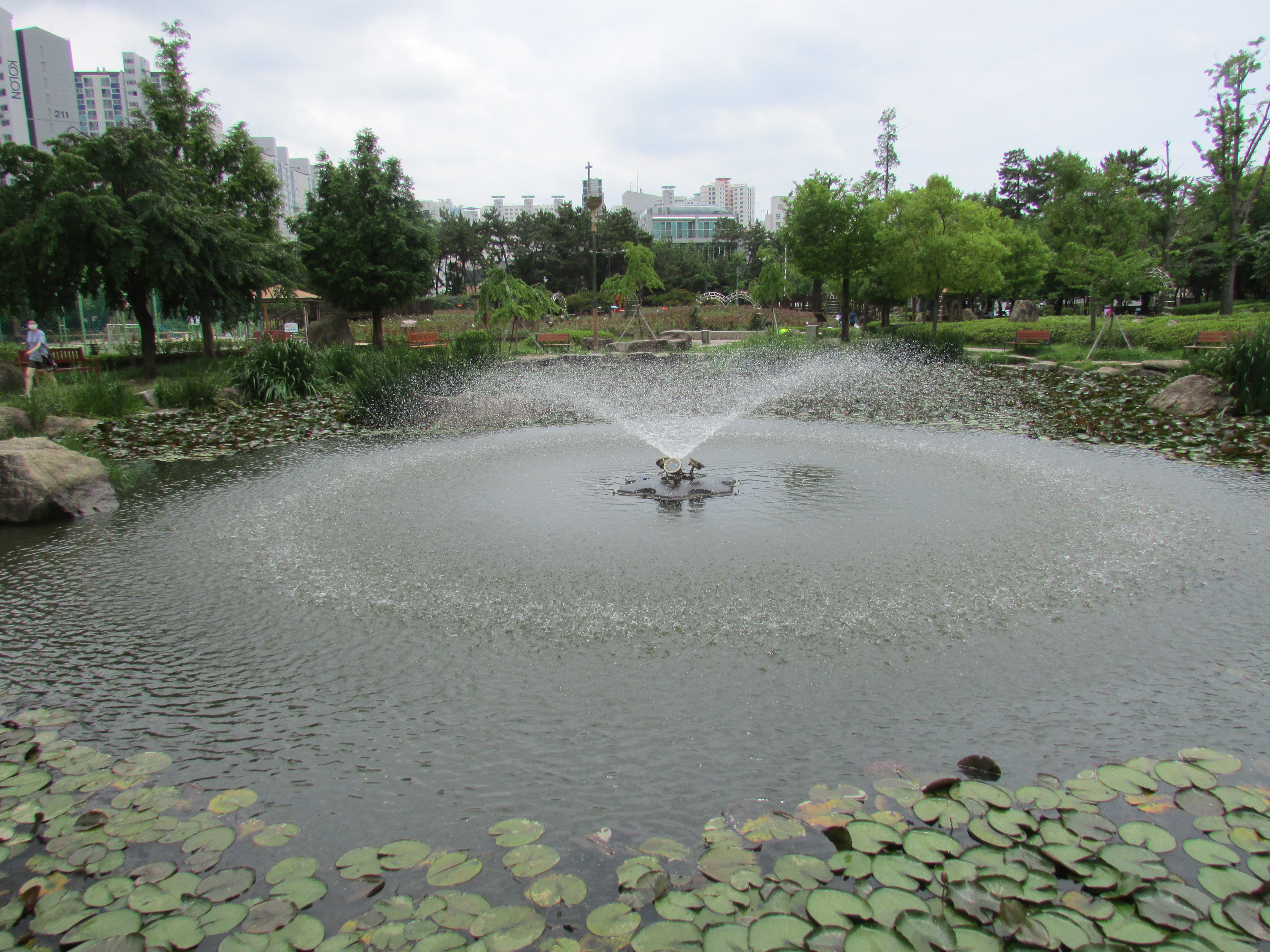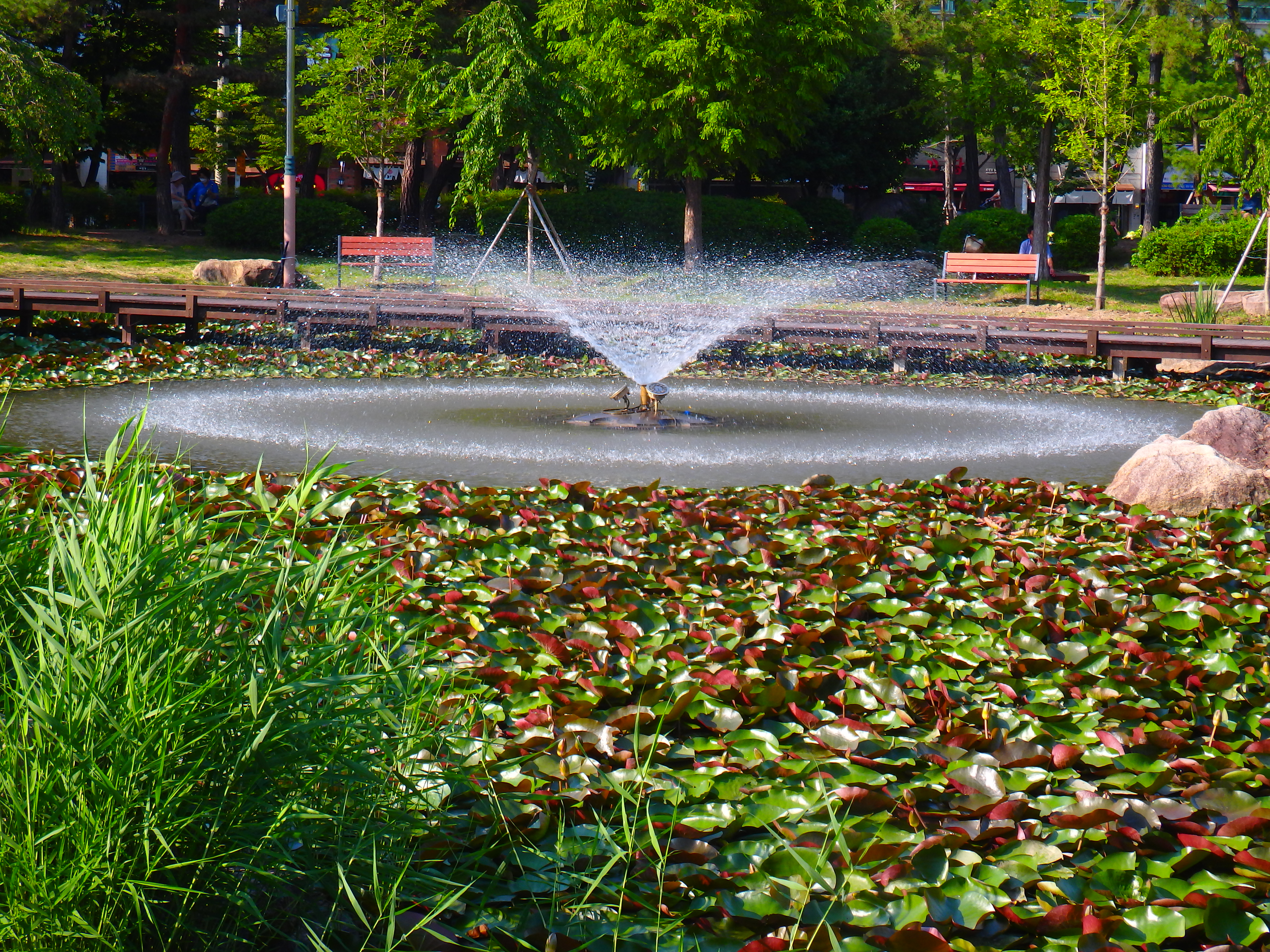 뜨거운 여름의 뙤약볕 속에서도 연못의