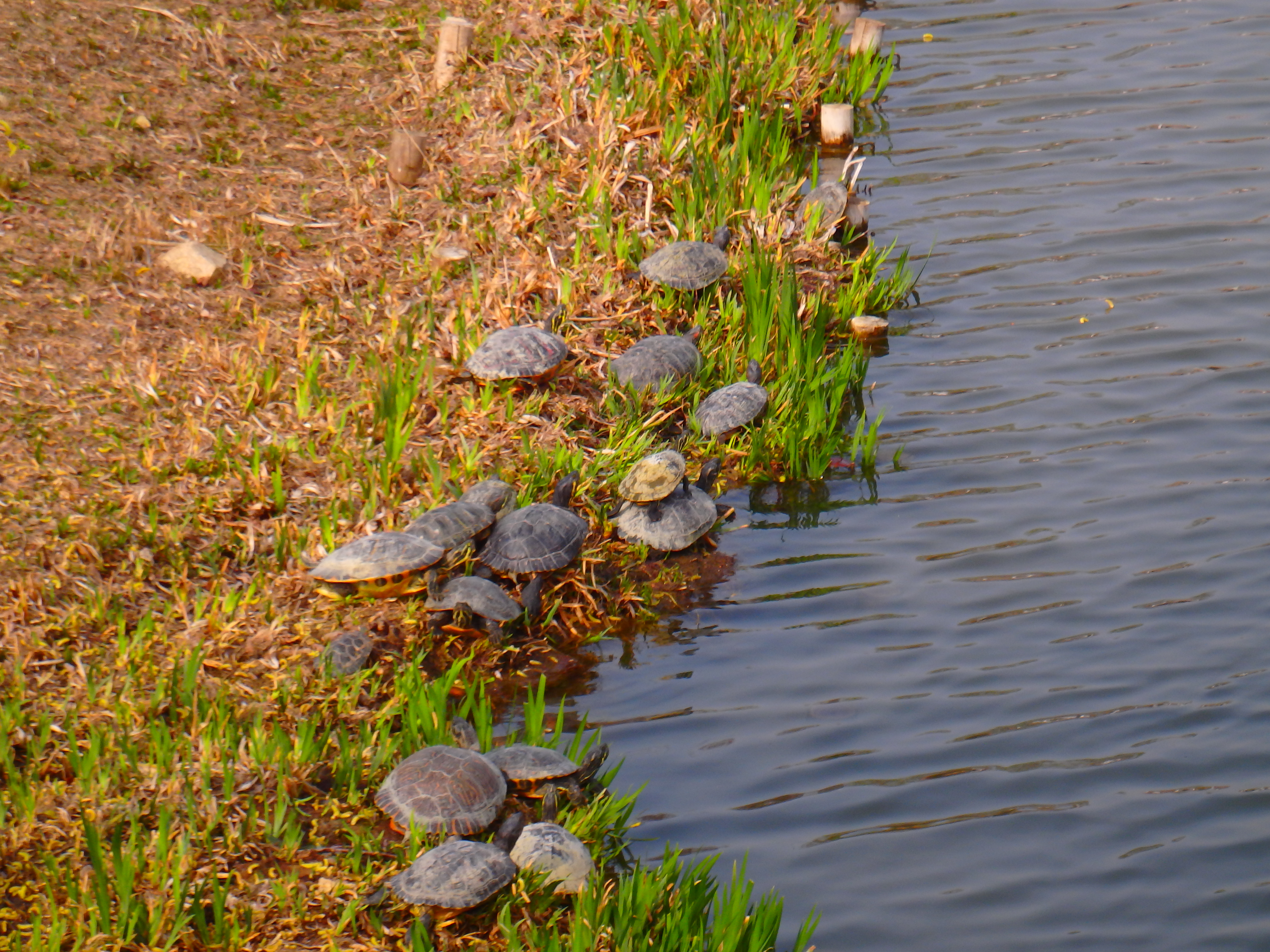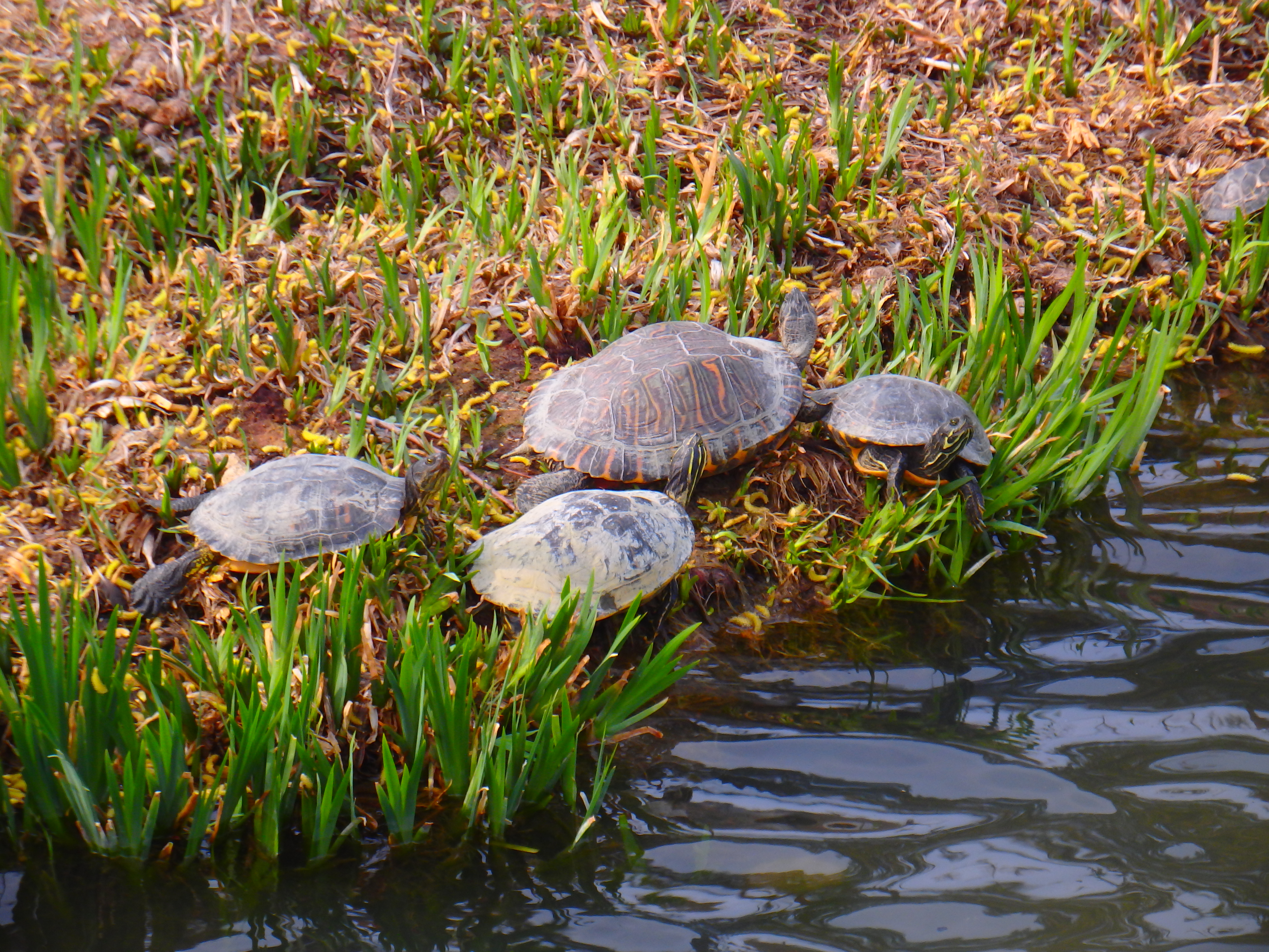먹이를 찾는 오리들과 색깔 고운 금붕어들이
