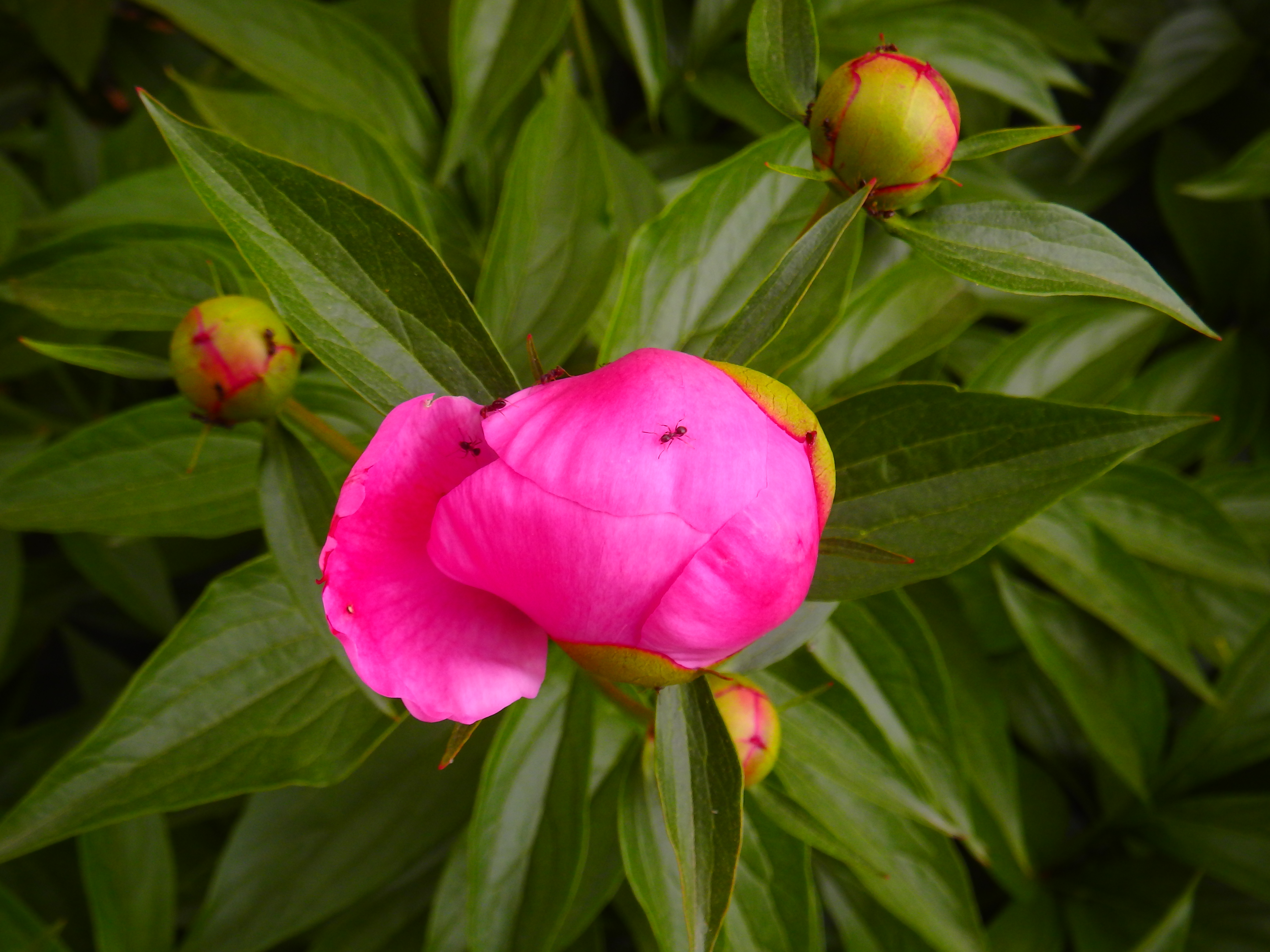 시골의 앞뜰에 함박꽃들이 피었다.