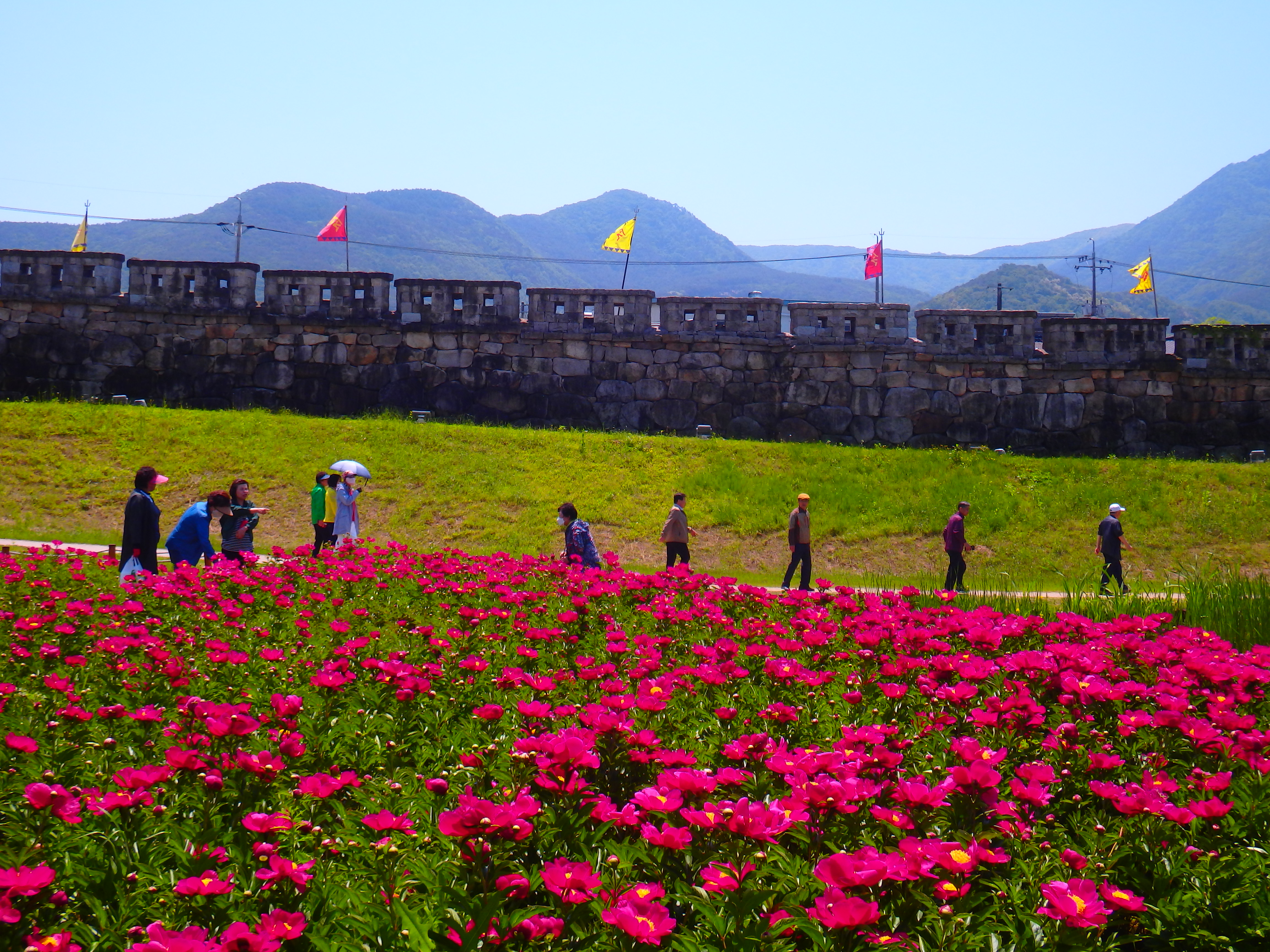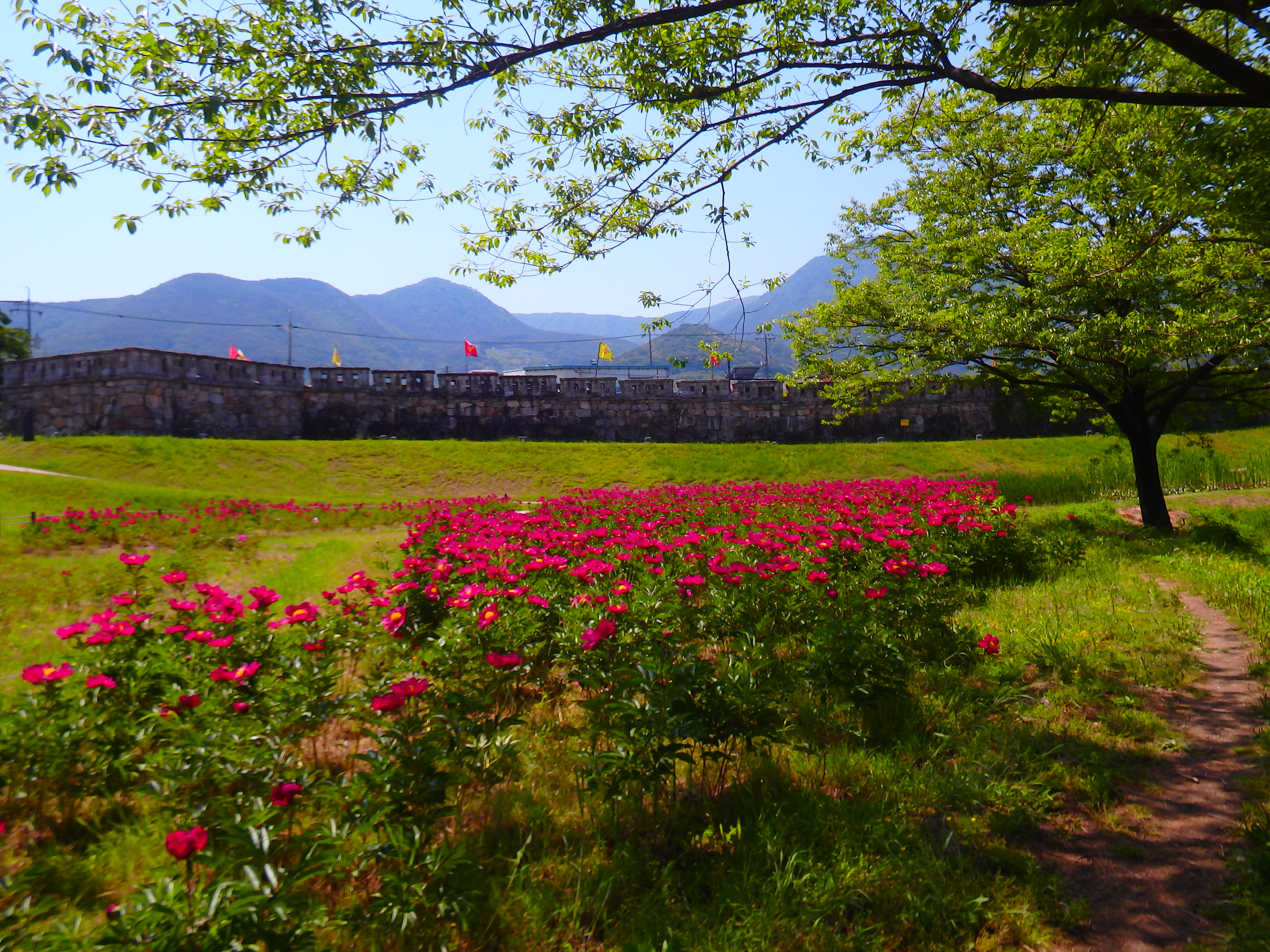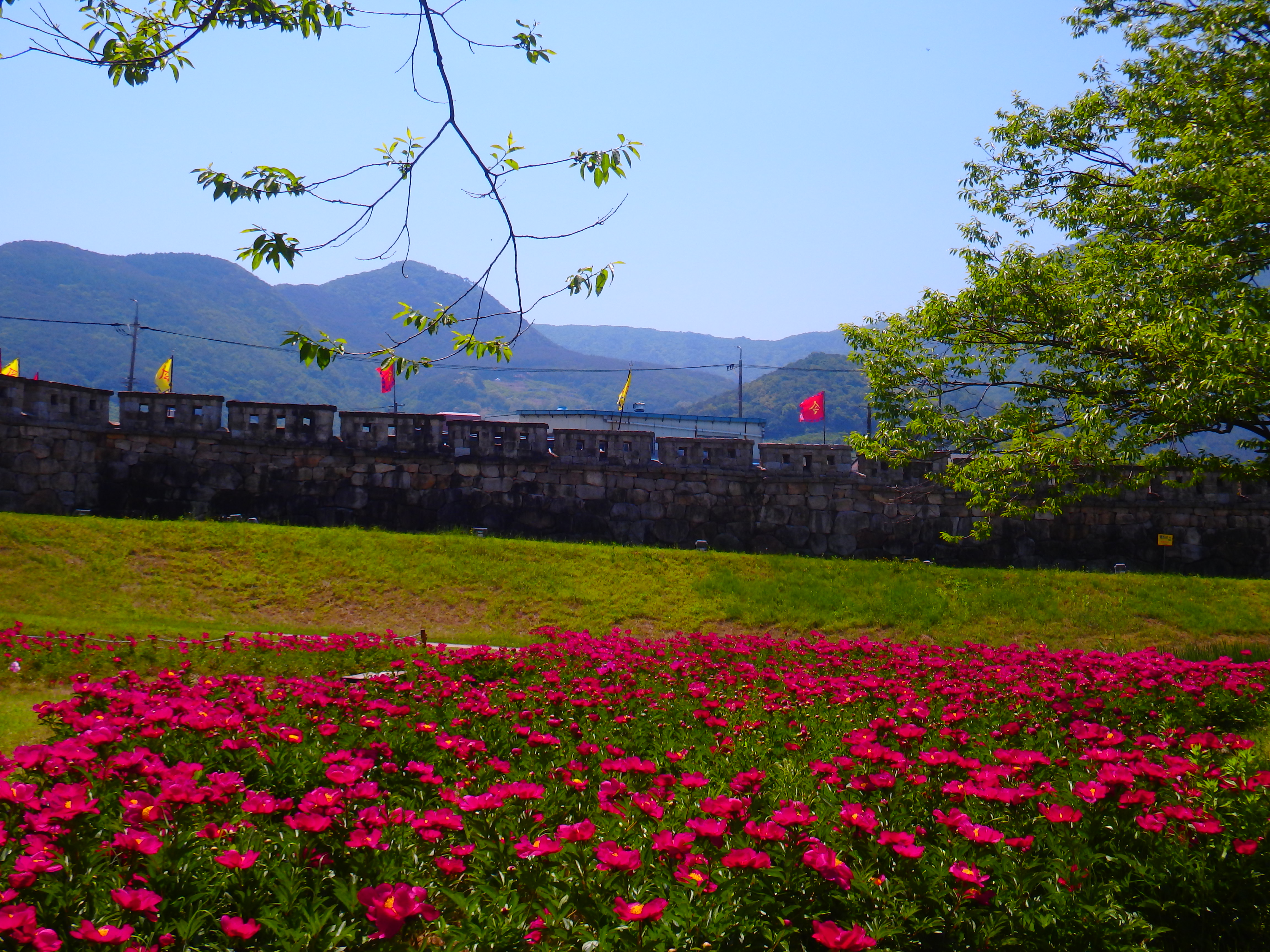 성벽 아래로 조성된 작약꽃밭과 어울린