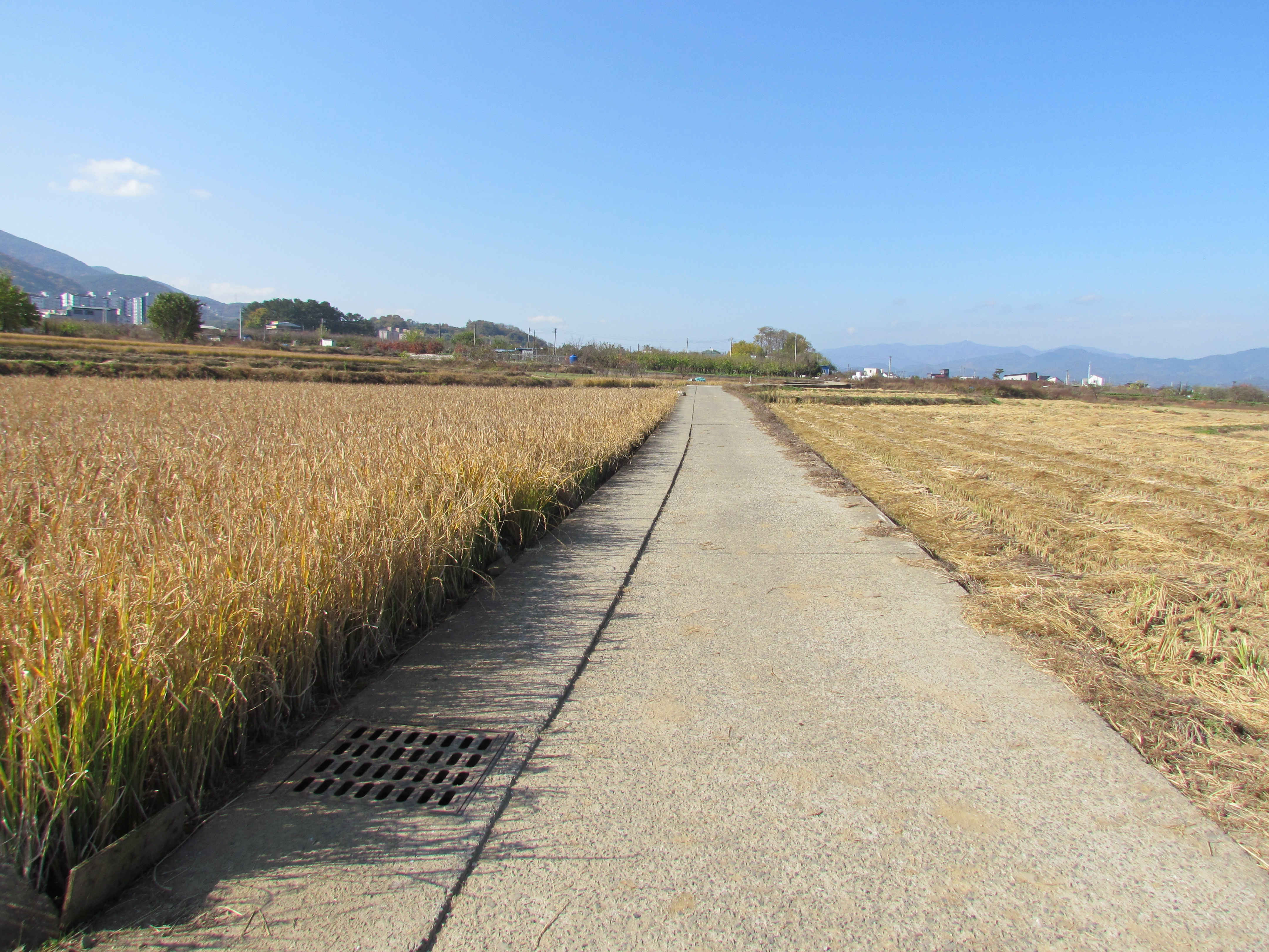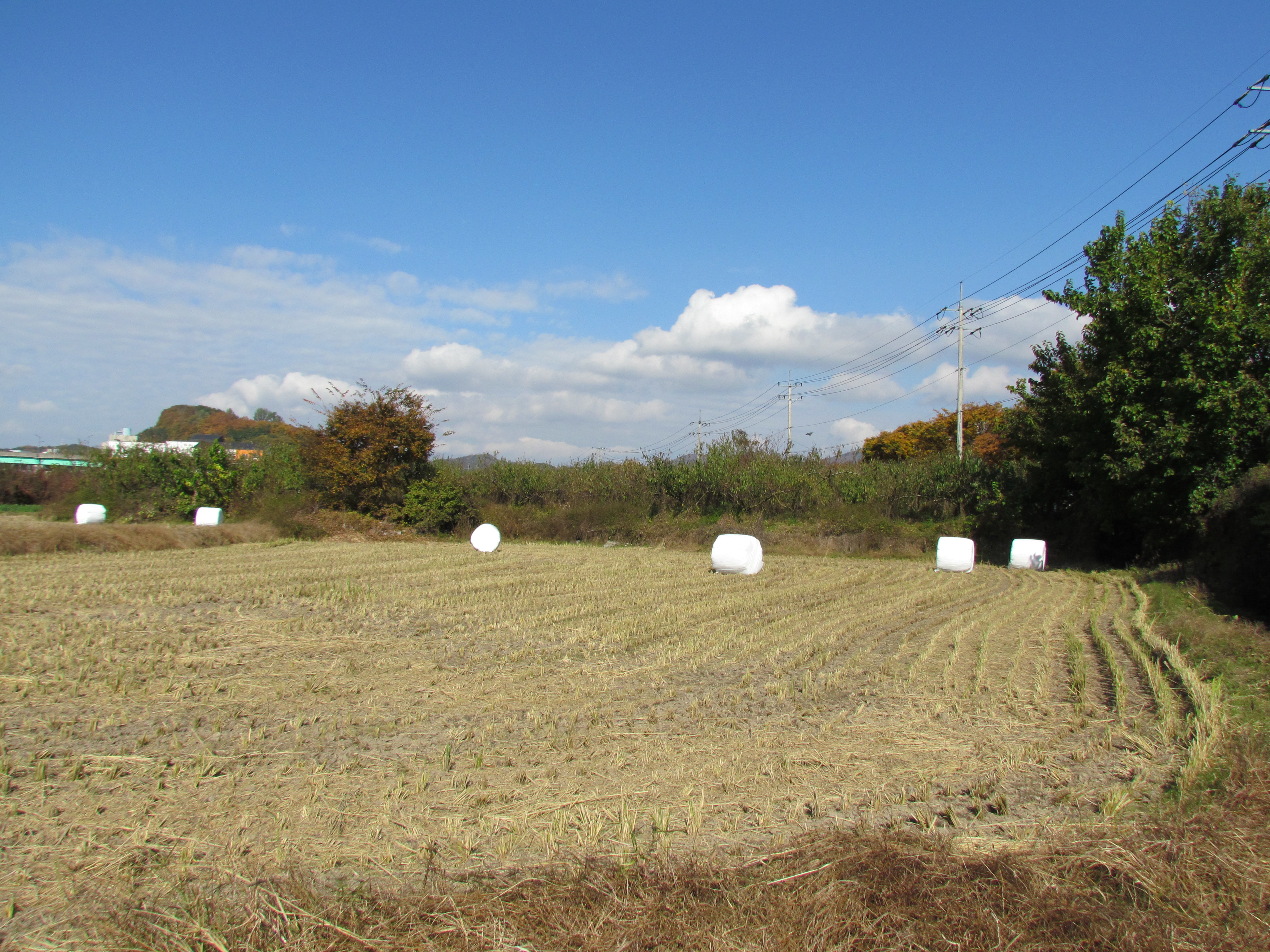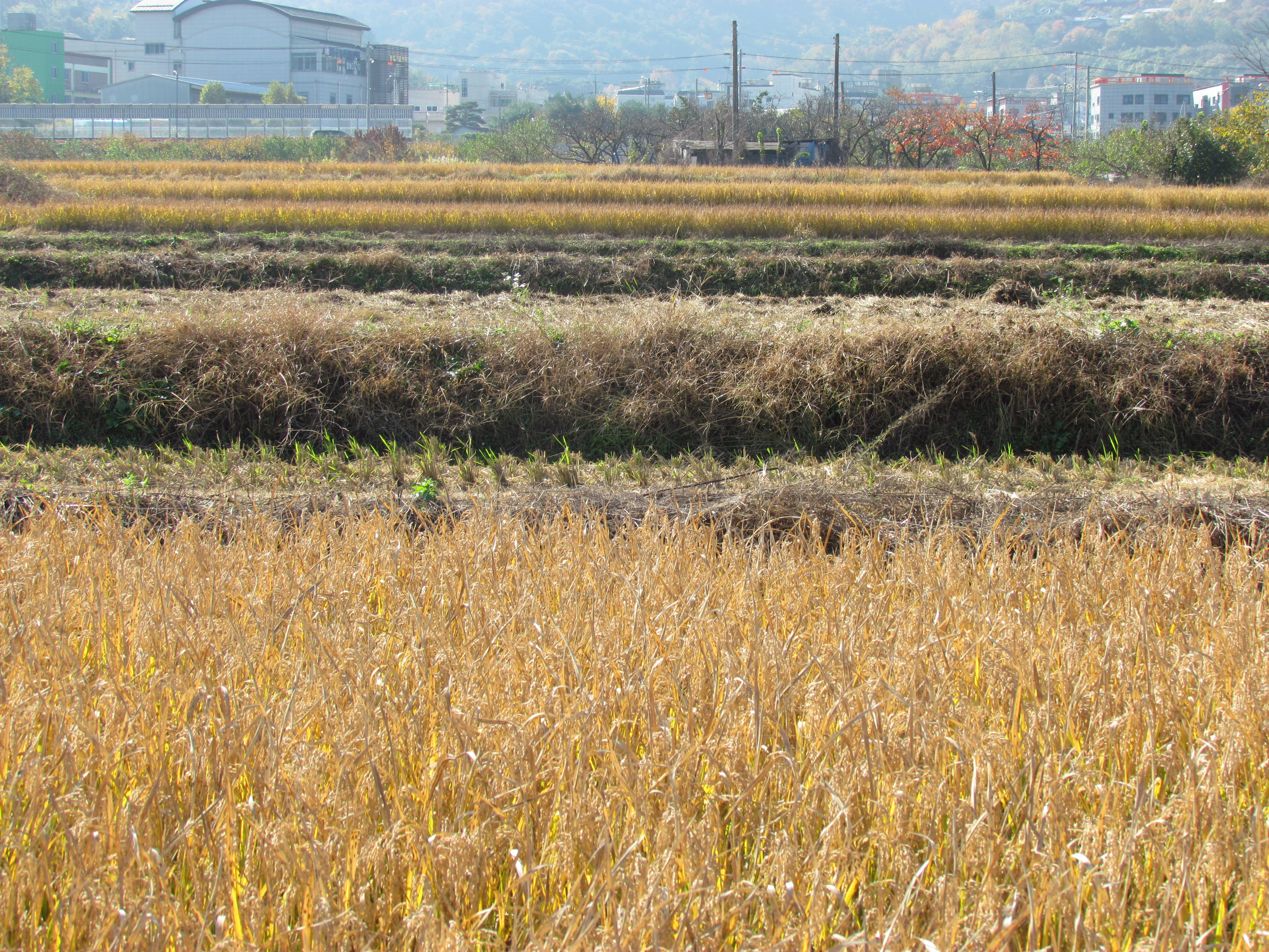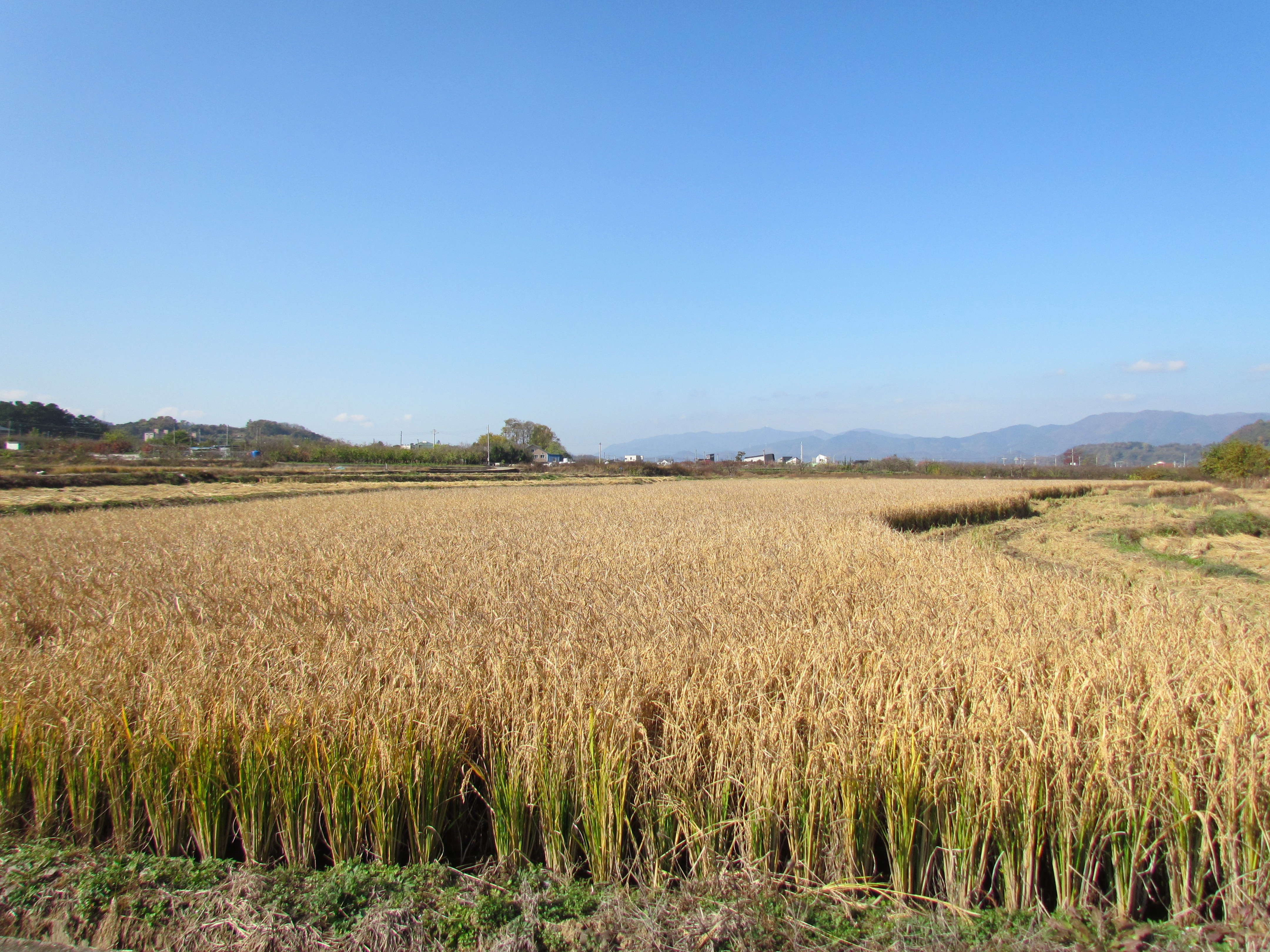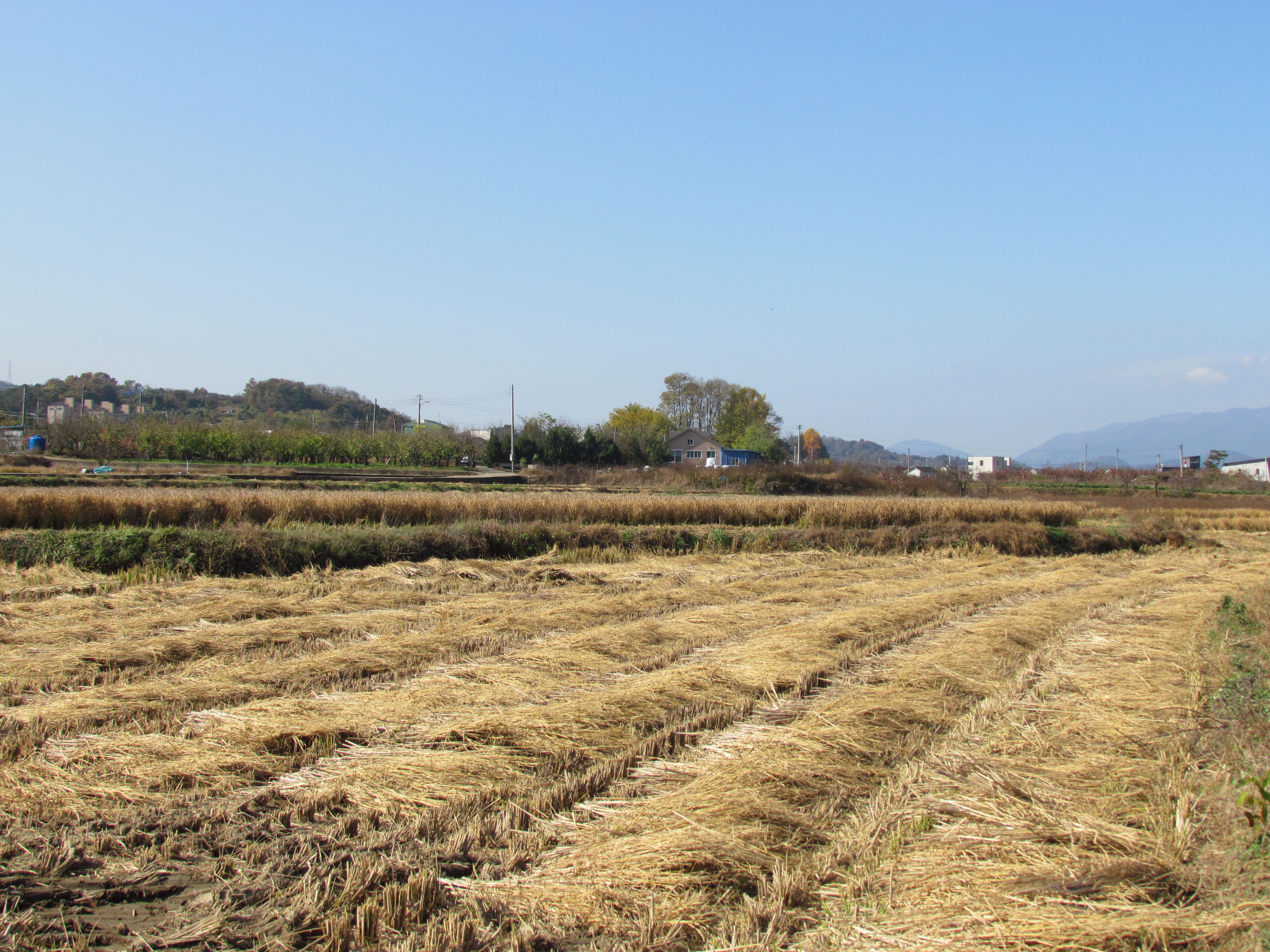 넓은 들녘에 곡식들이 익어 추수한