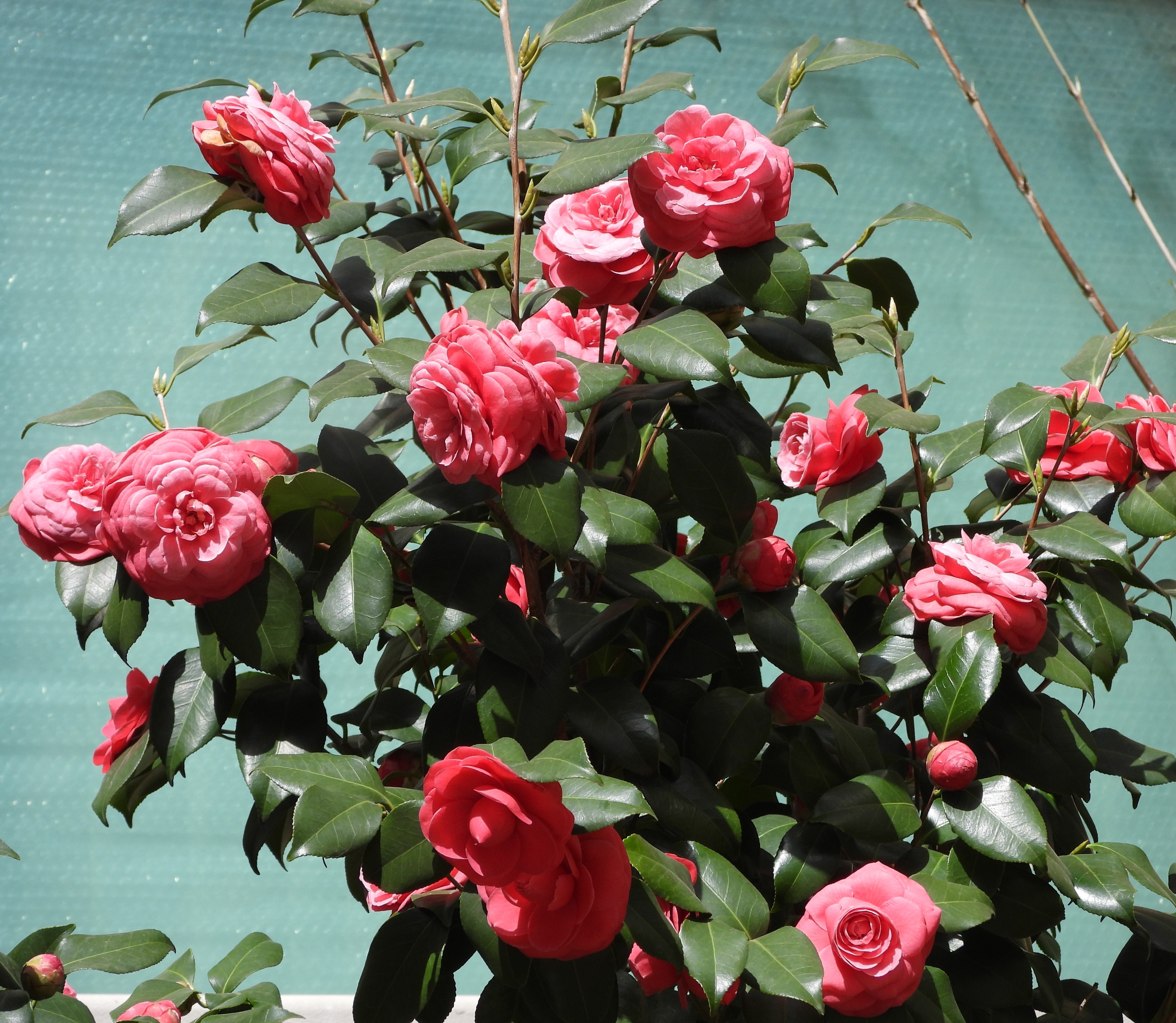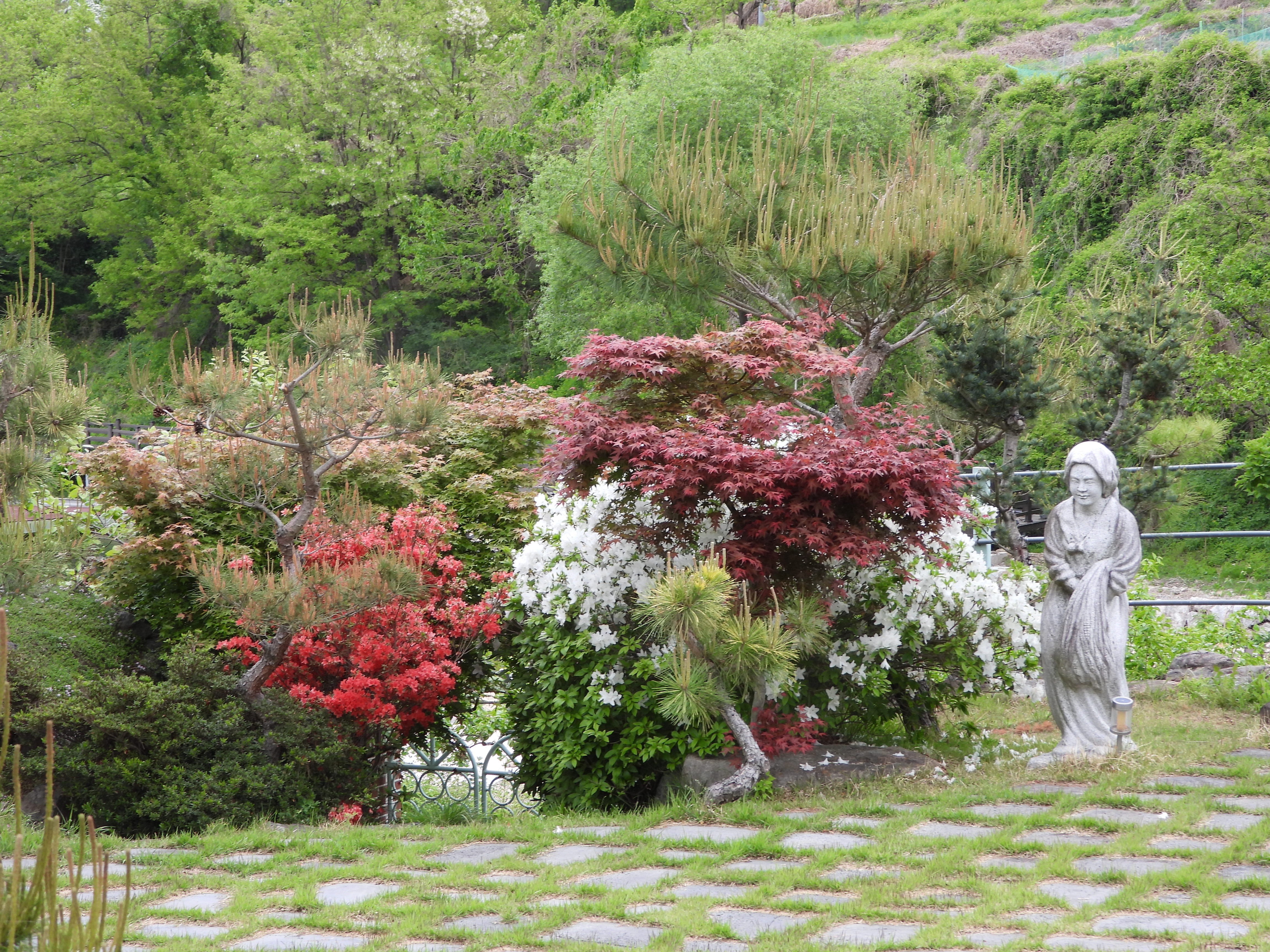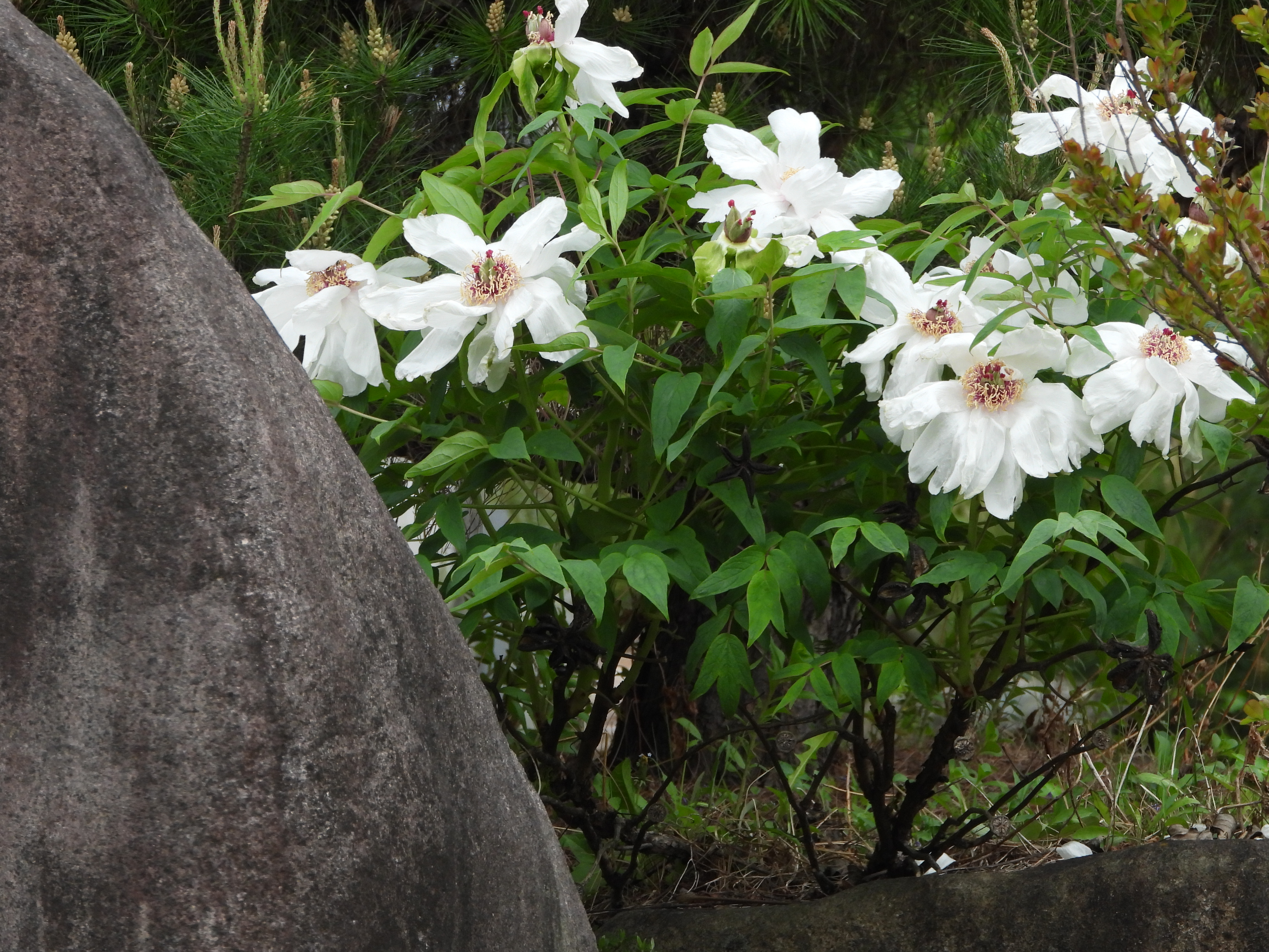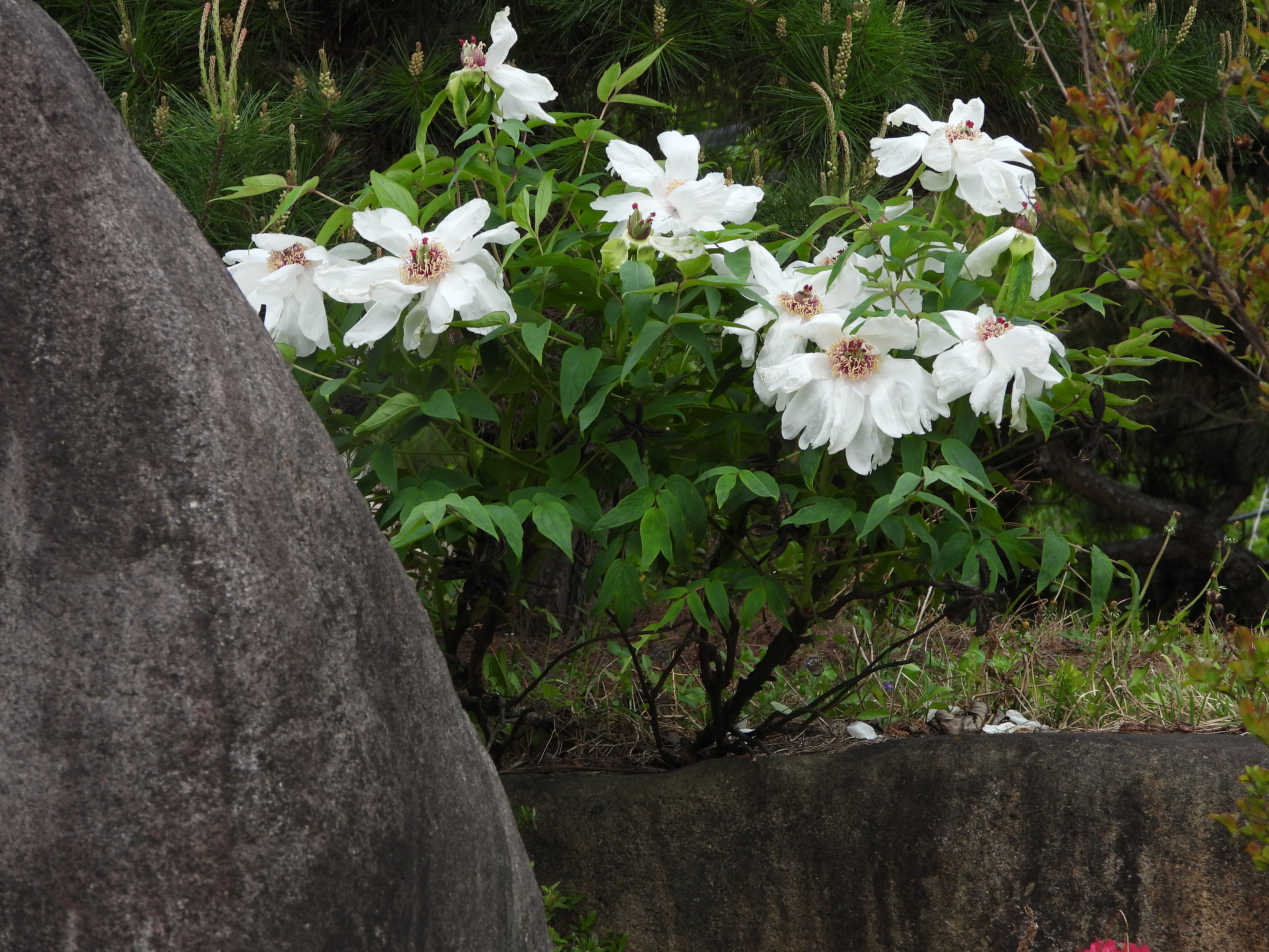 카페의 바위옆에만 흰 모란꽃이 보여