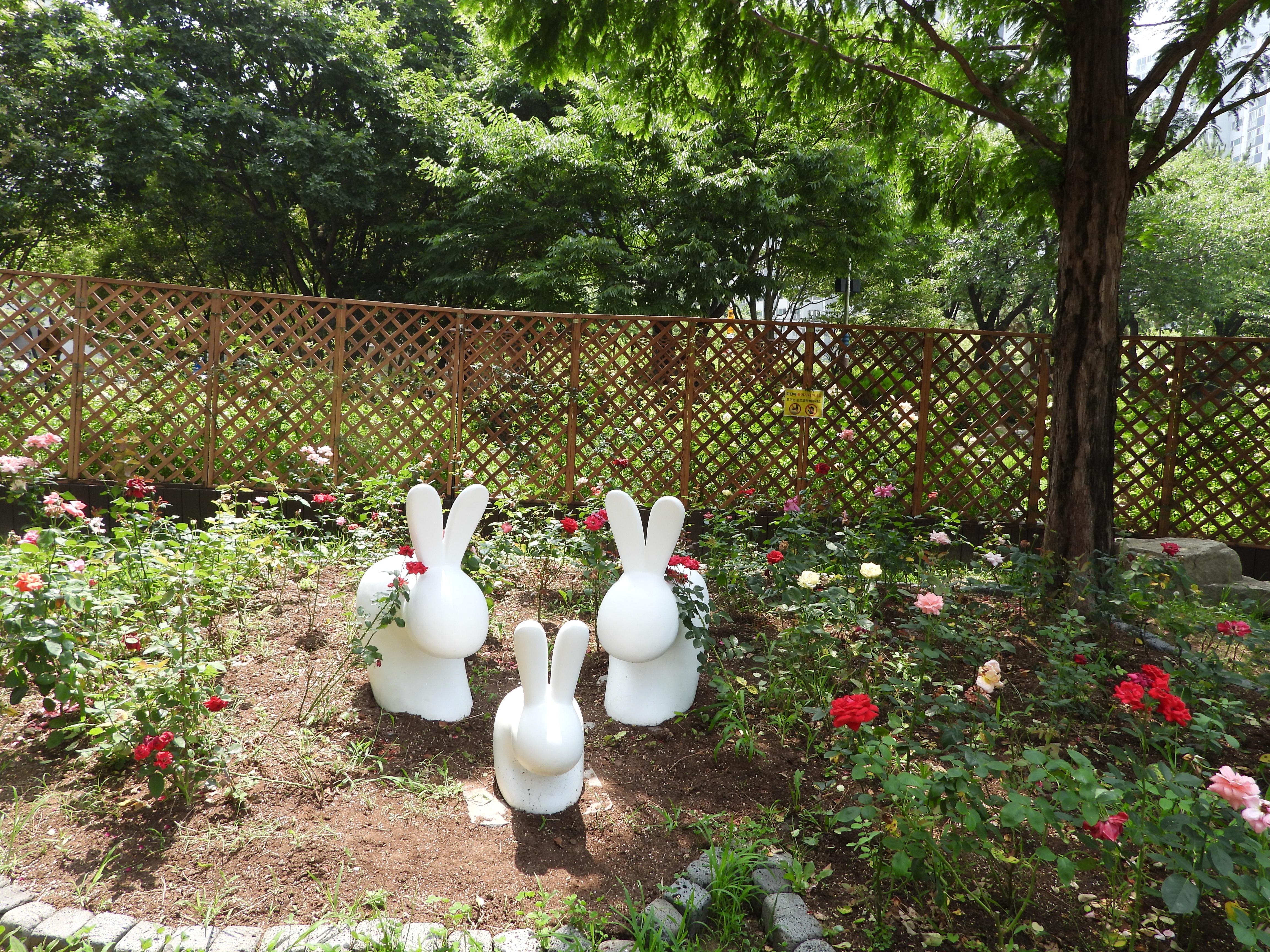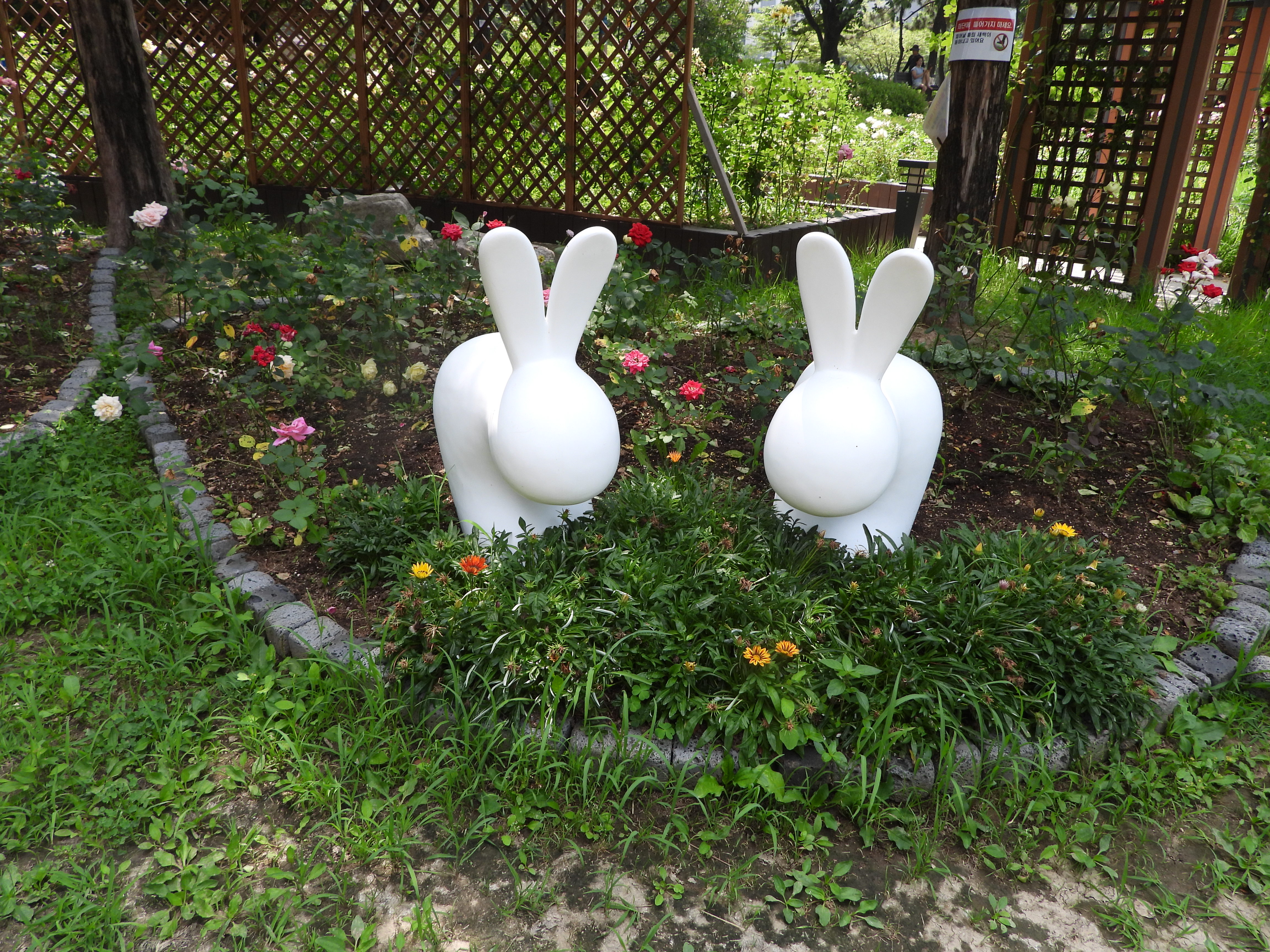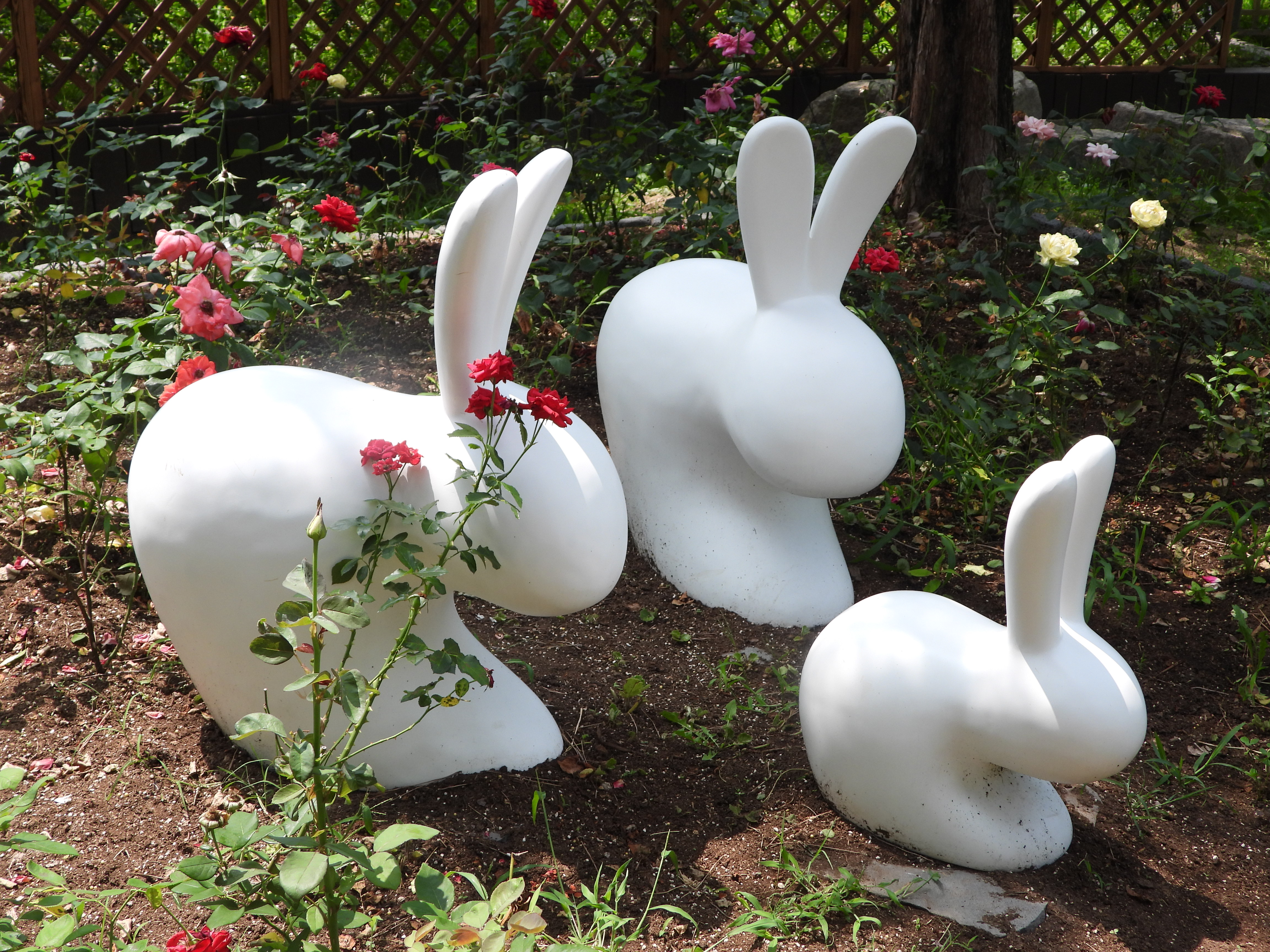 장미원의 한쪽에는 흰 토끼들이 보였다.