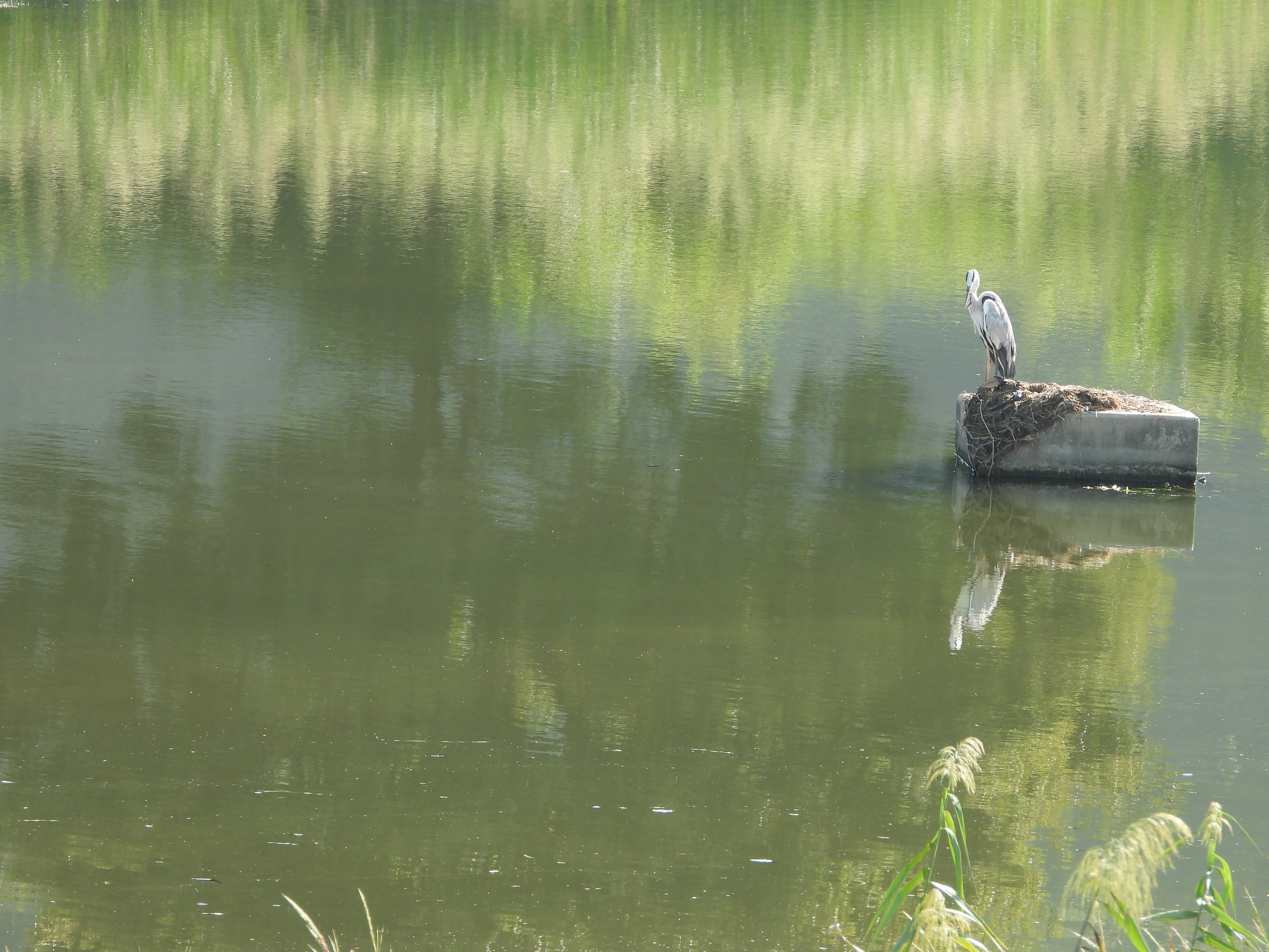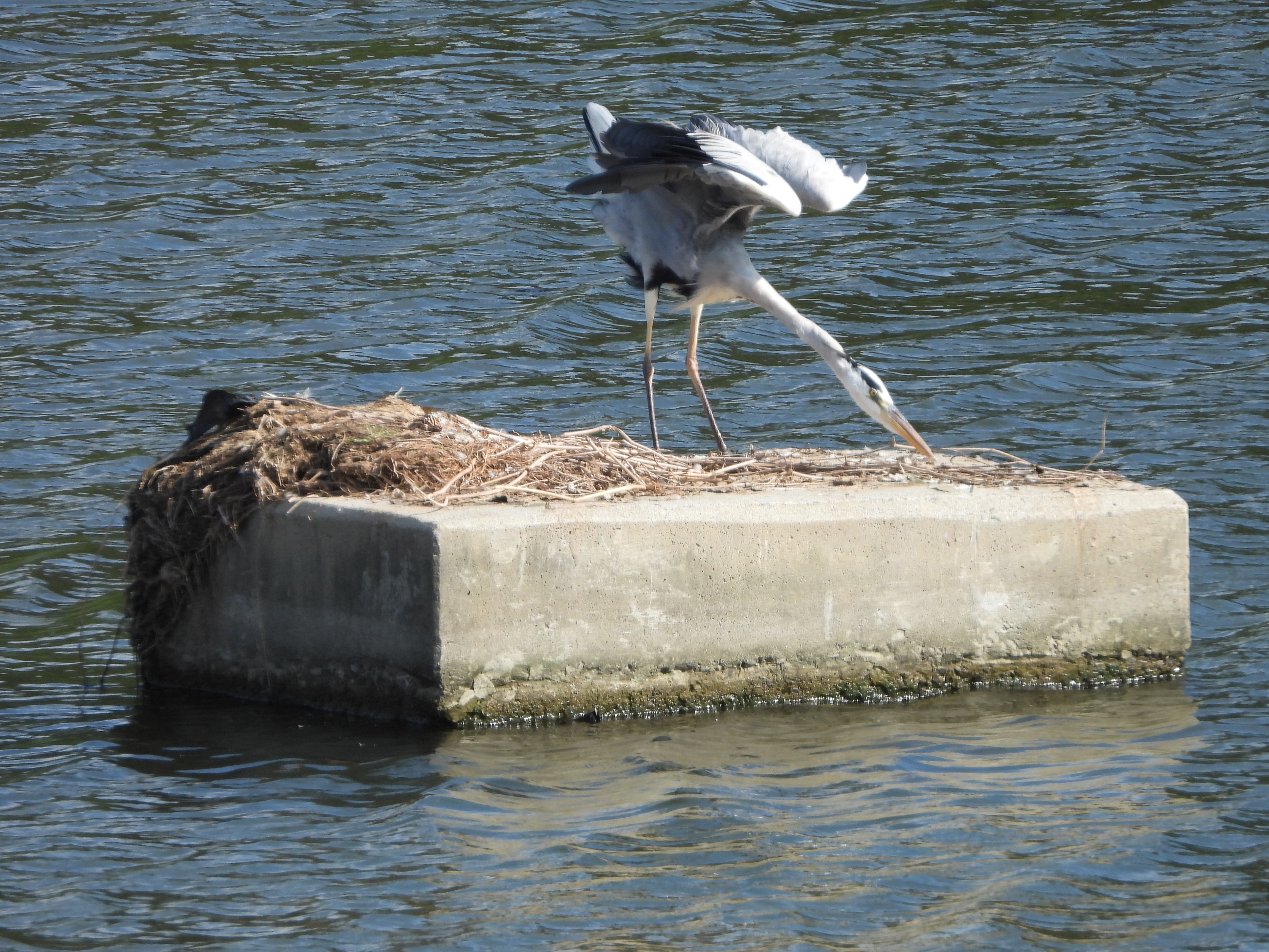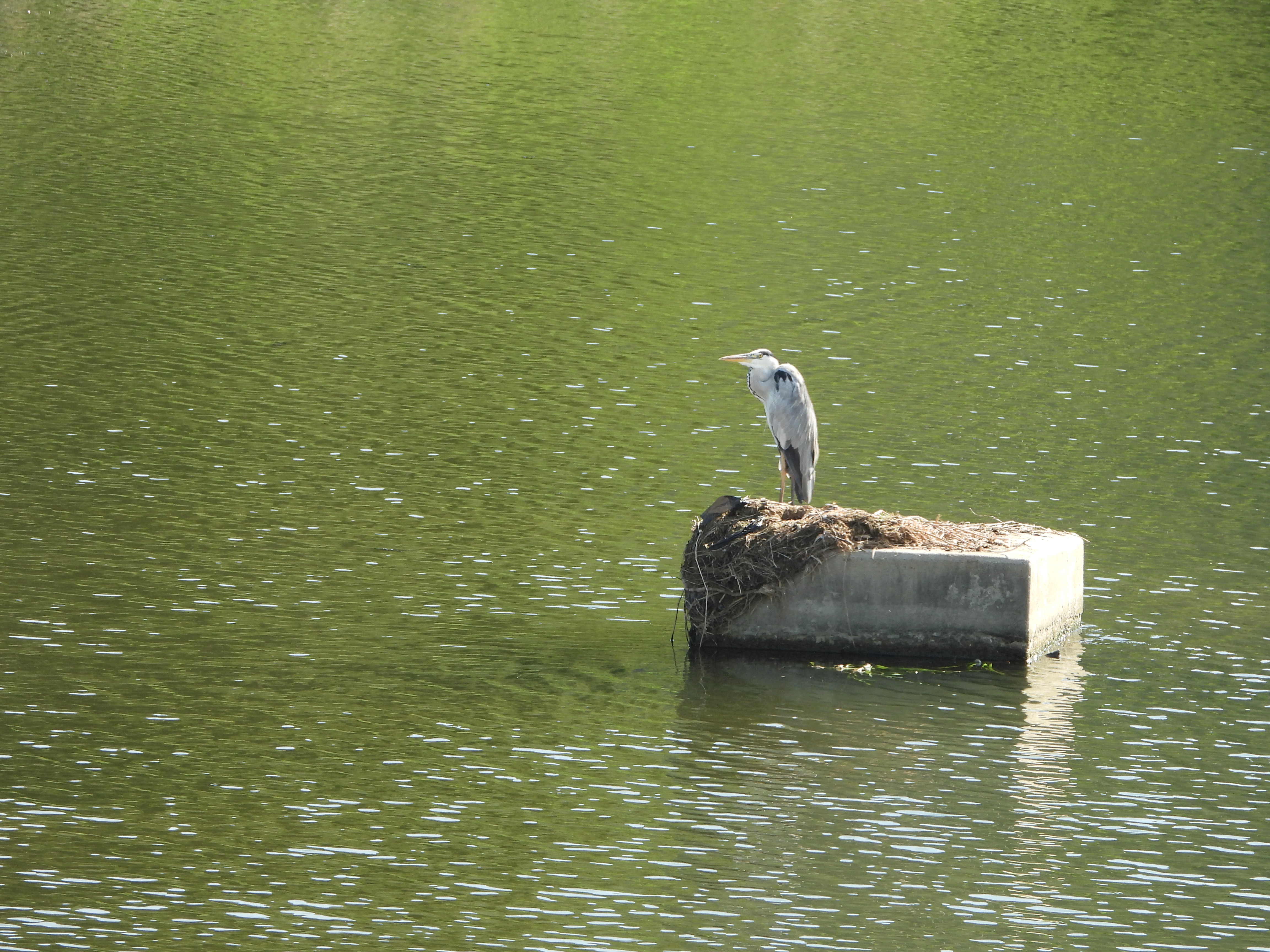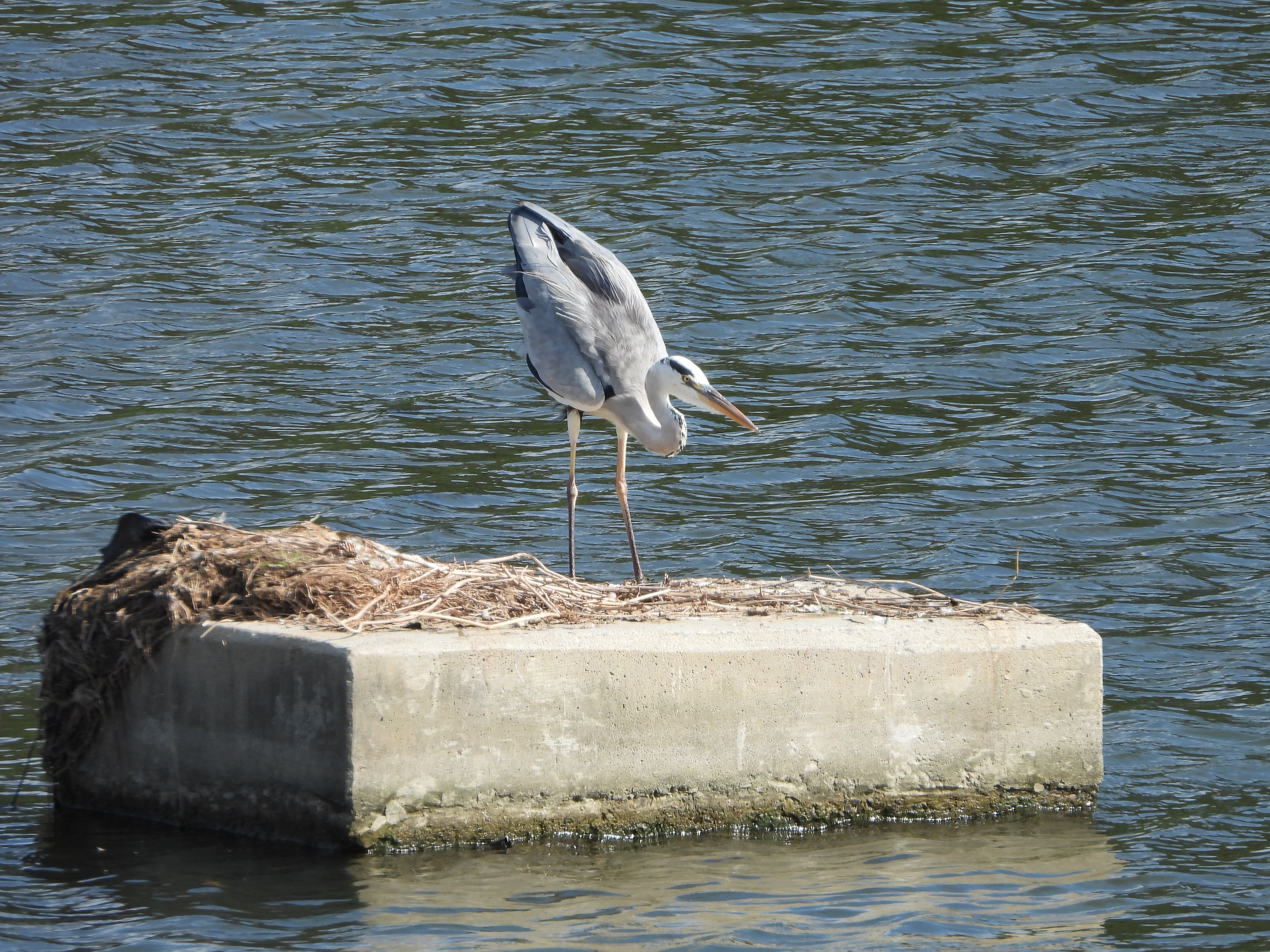 왜가리는 홀로 쉼터에서 고개를 숙여
