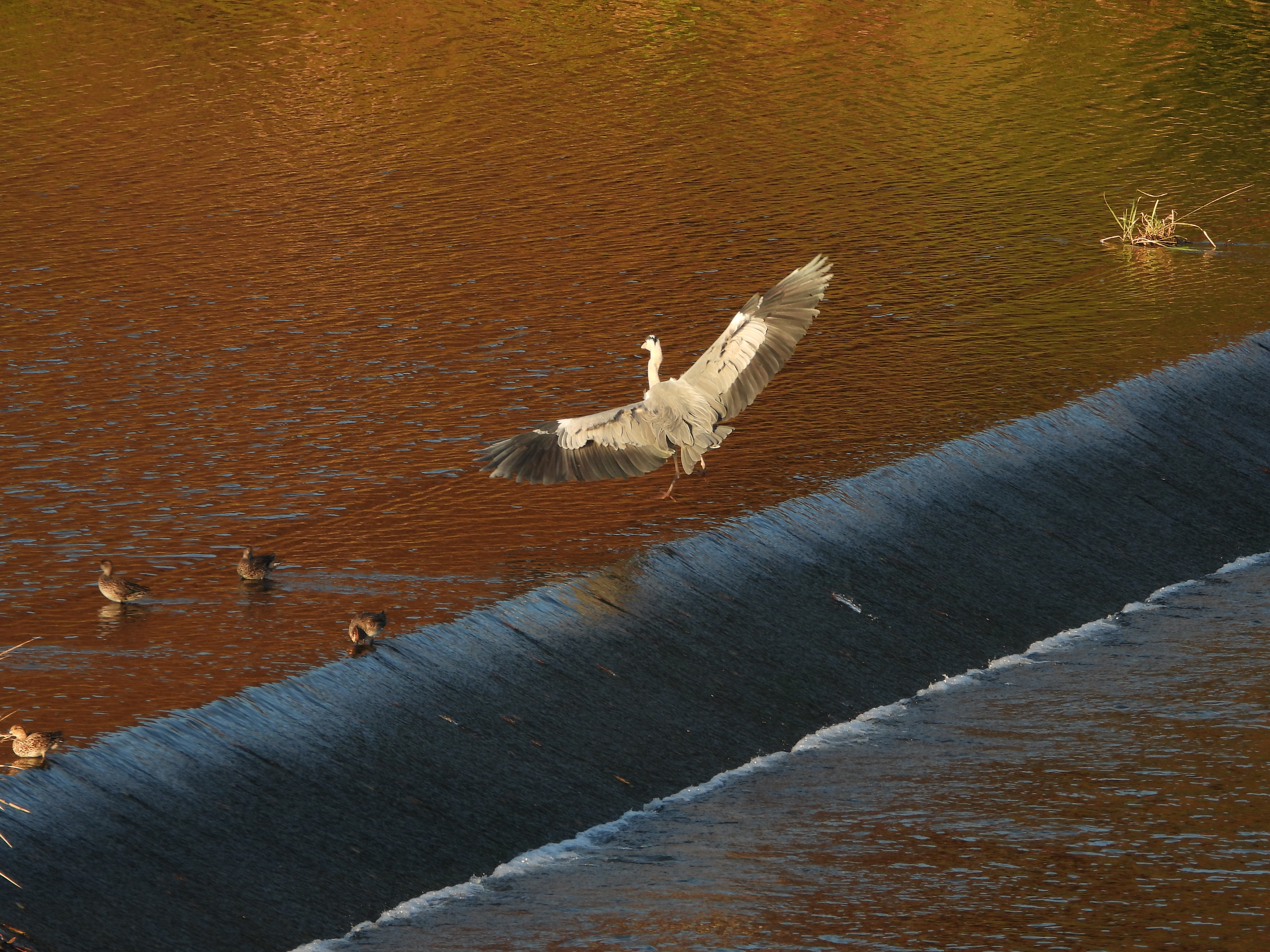 석양의 강변에 백로와 왜가리, 오리들이